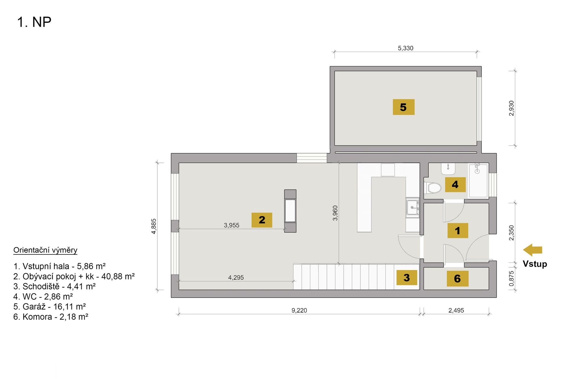 Dominantou přízemí je prostorný obývací pokoj s kuchyňským koutem (40,88 m²), který tvoří srdce celého domu. Přímý vstup na zahradu přirozeně propojuje interiér s exteriérem a vytváří ideální prostor pro každodenní život i relaxaci.