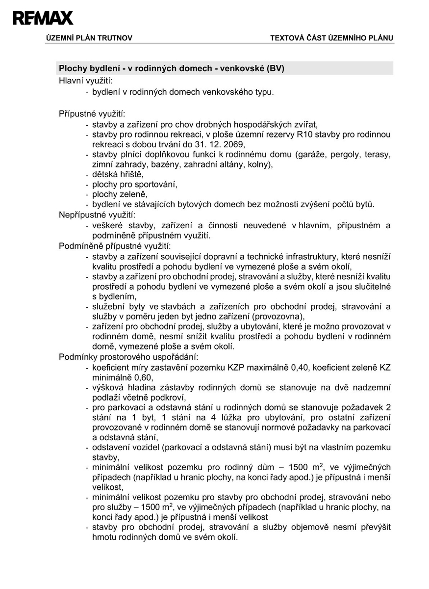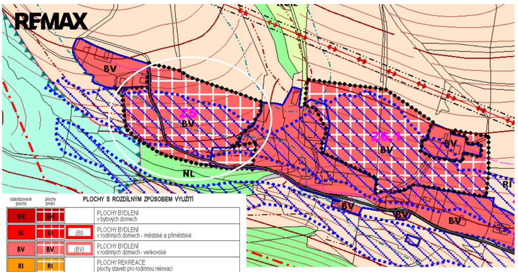 Pozemek má rozlohu 20139m², v územním plánu obce spadá do kategorie – plochy bydlení – v rodinných domech – venkovské (BV), což umožňuje výstavbu rodinného domu dle Vašich představ a to, až dvě nadzemní podlaží včetně podkroví. Minimální velikost pozemku pro rodinný dům 1500m2, ve výjimečných případech např. u hranic plochy, na konci řady apod., je přípustná i menší velikost.