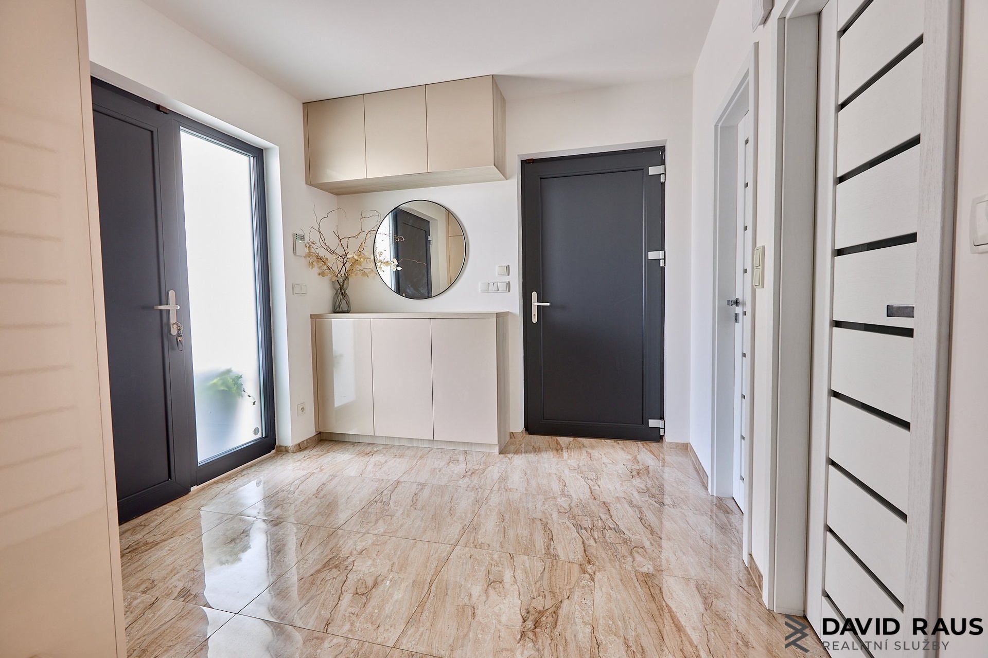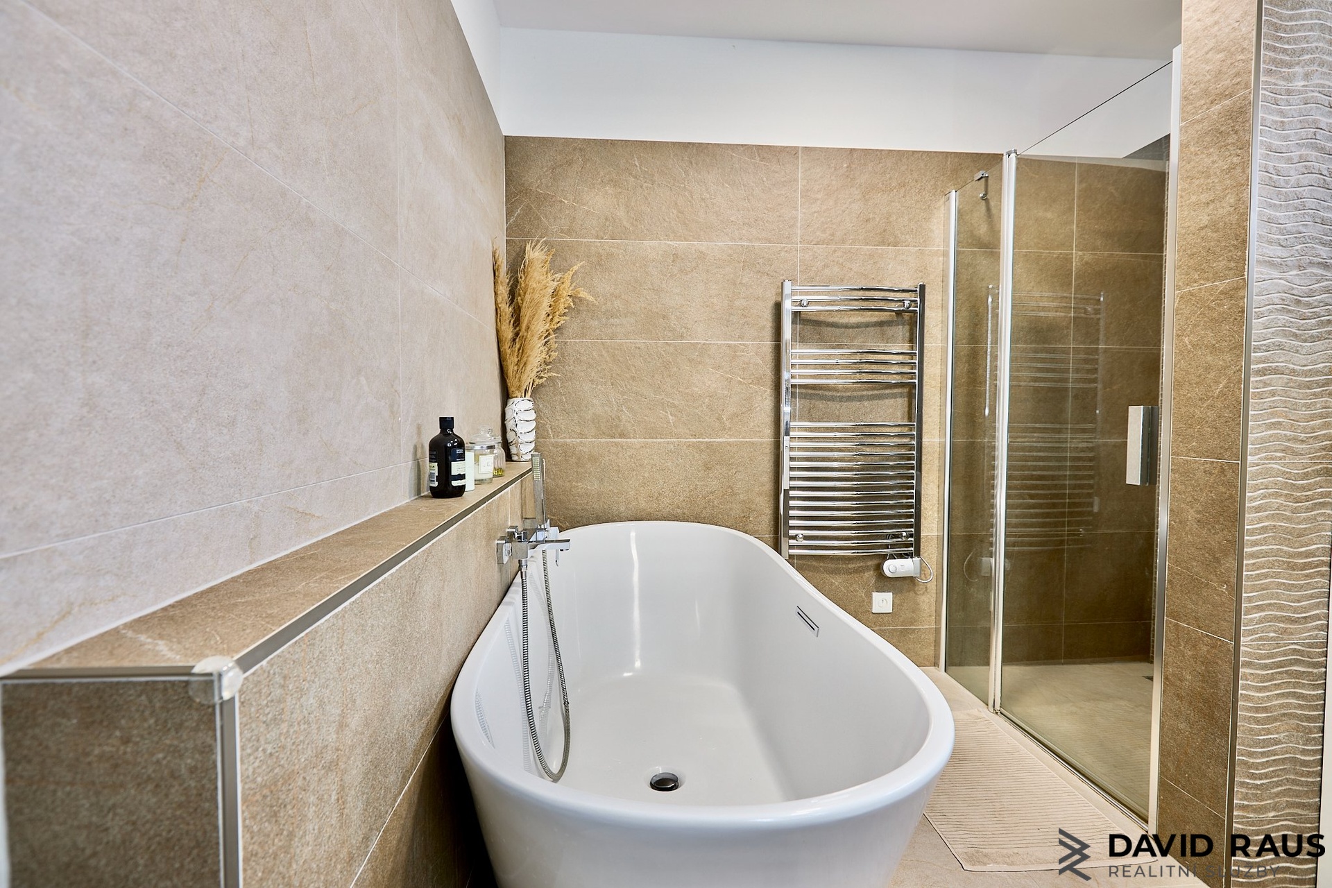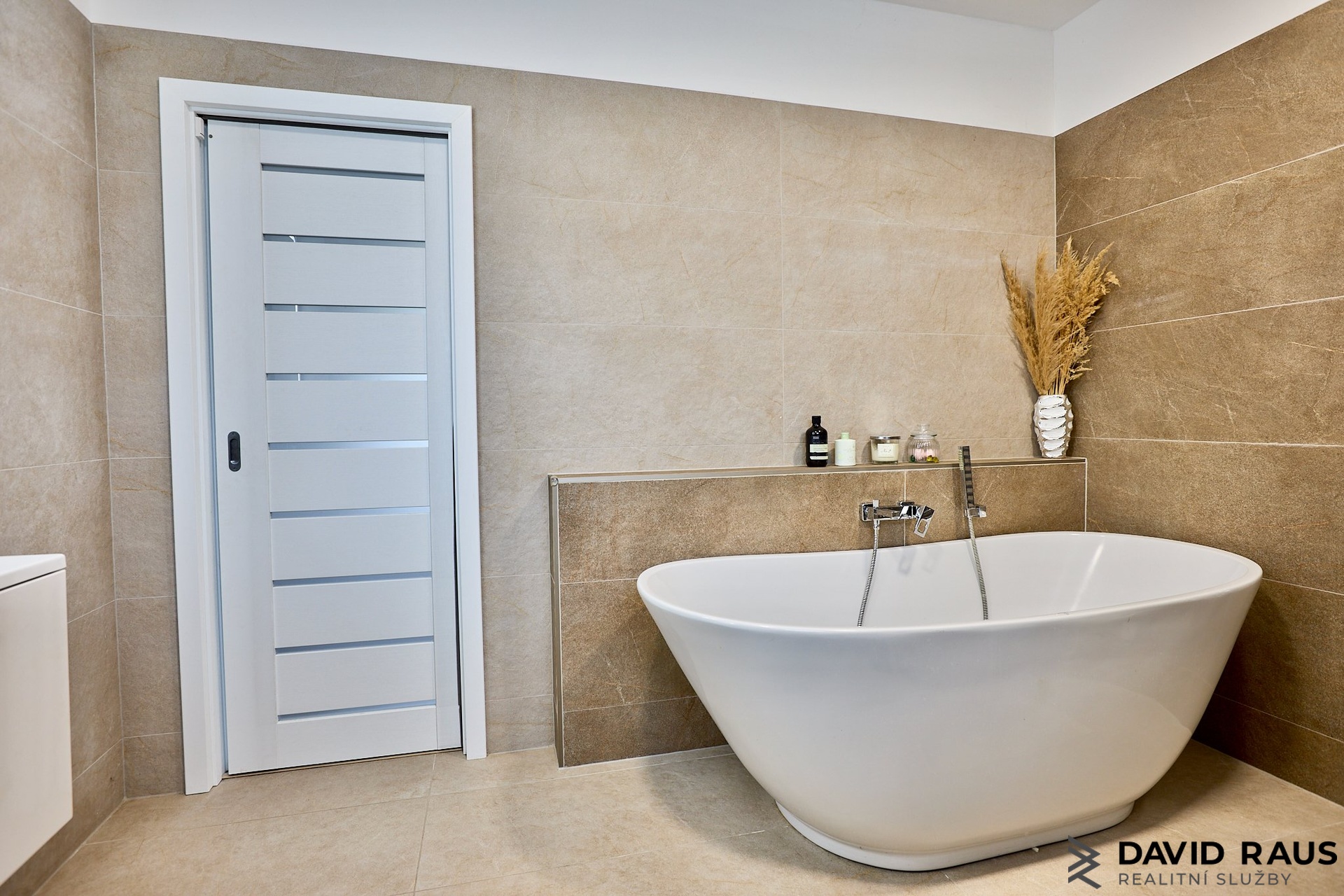 Ložnice i dětský pokoj mají francouzská okna se vstupem přímo na zahradu. Interiér je laděn do přírodních, světlých tónů – vinylové podlahy v béžovo-šedé barvě, bílé stěny, designové koupelny a tapeta s kapradím v ložnici vytváří moderní a útulnou atmosféru.