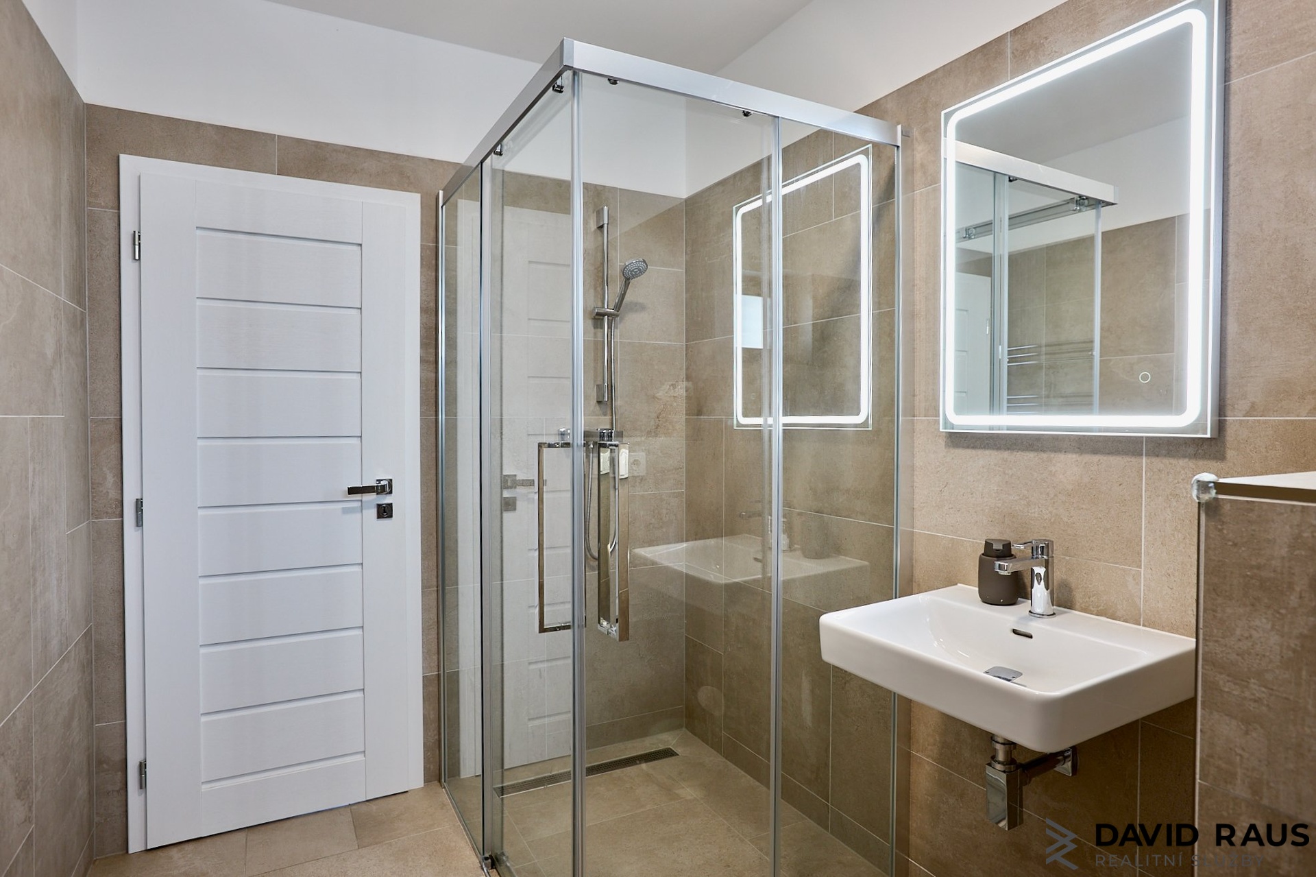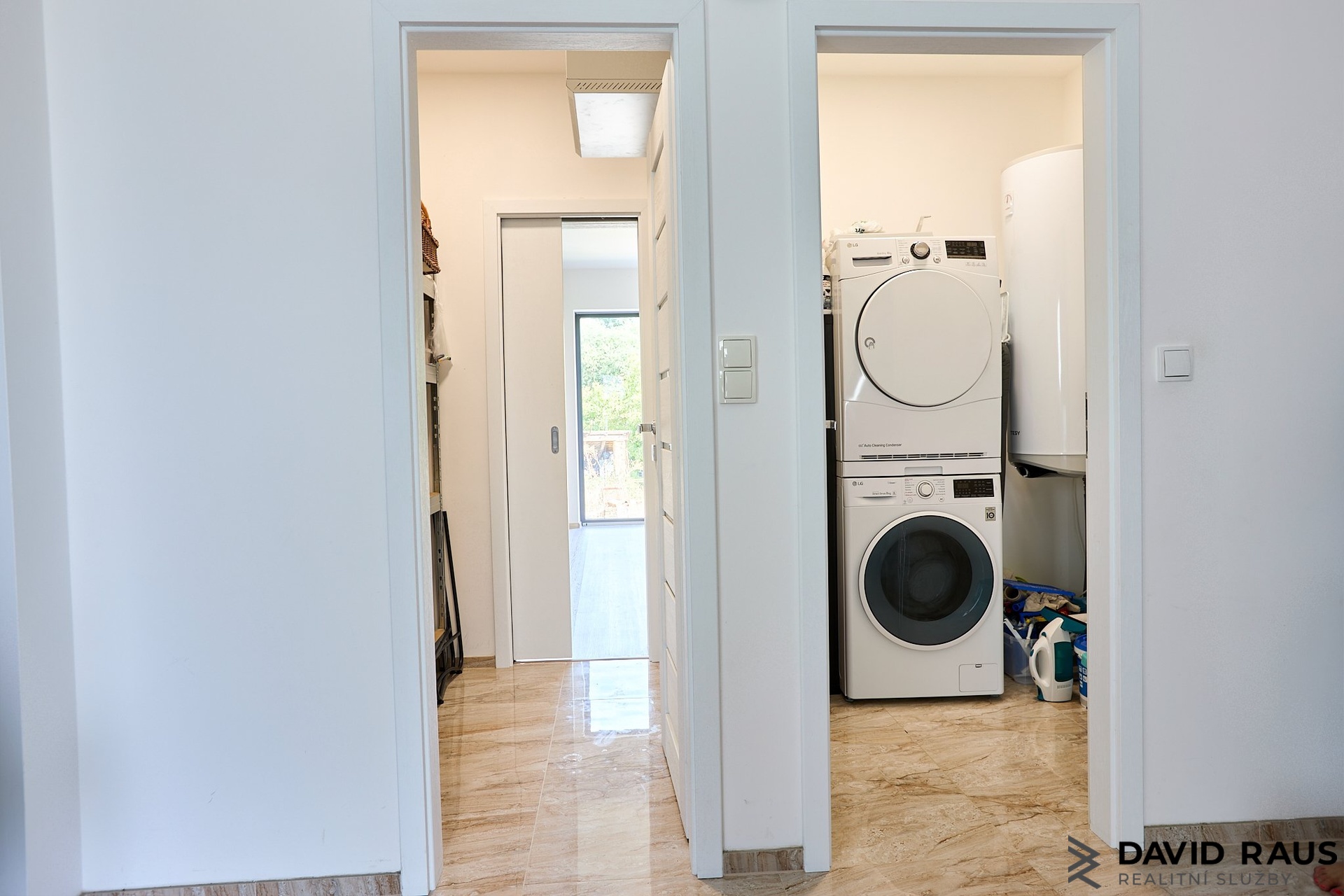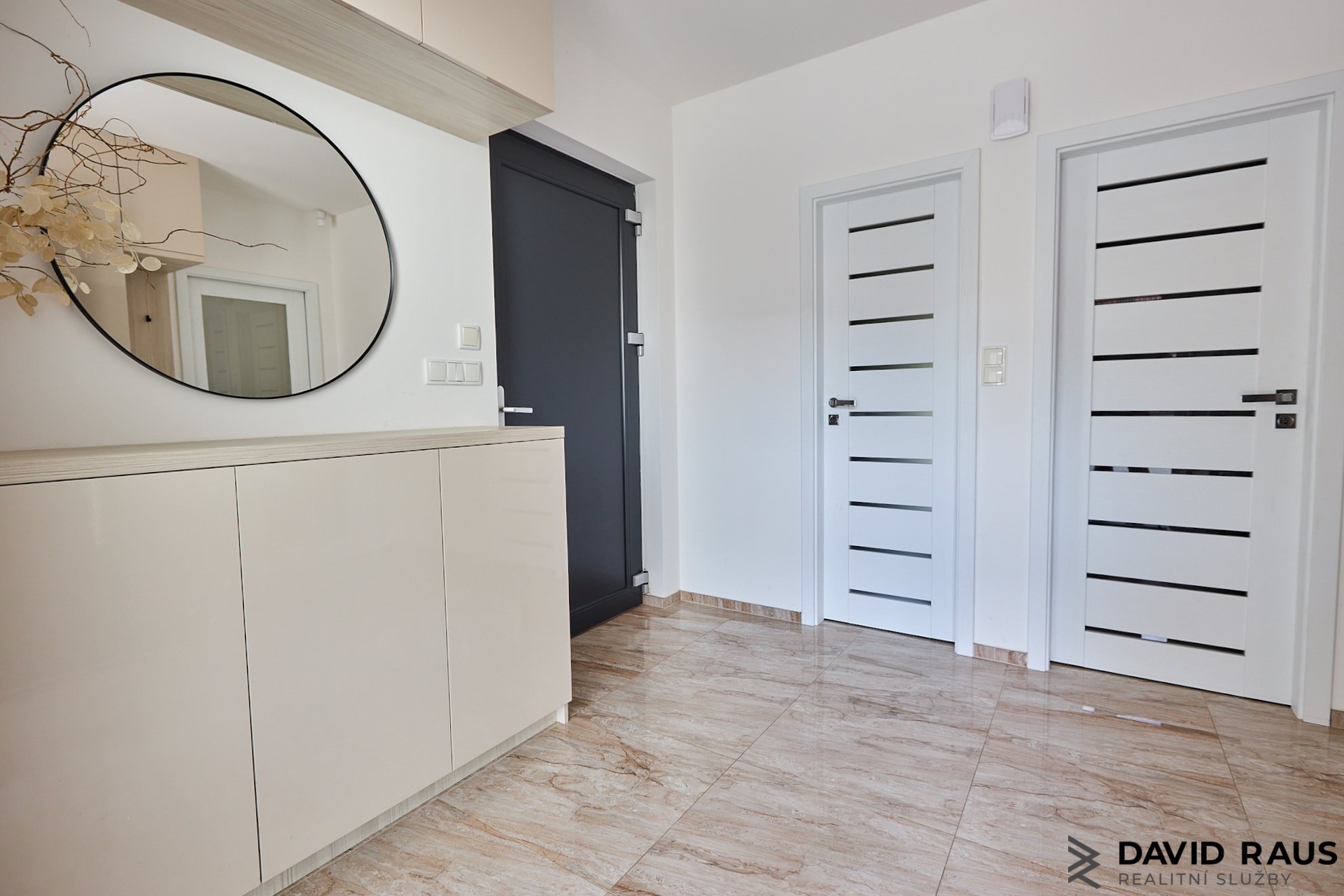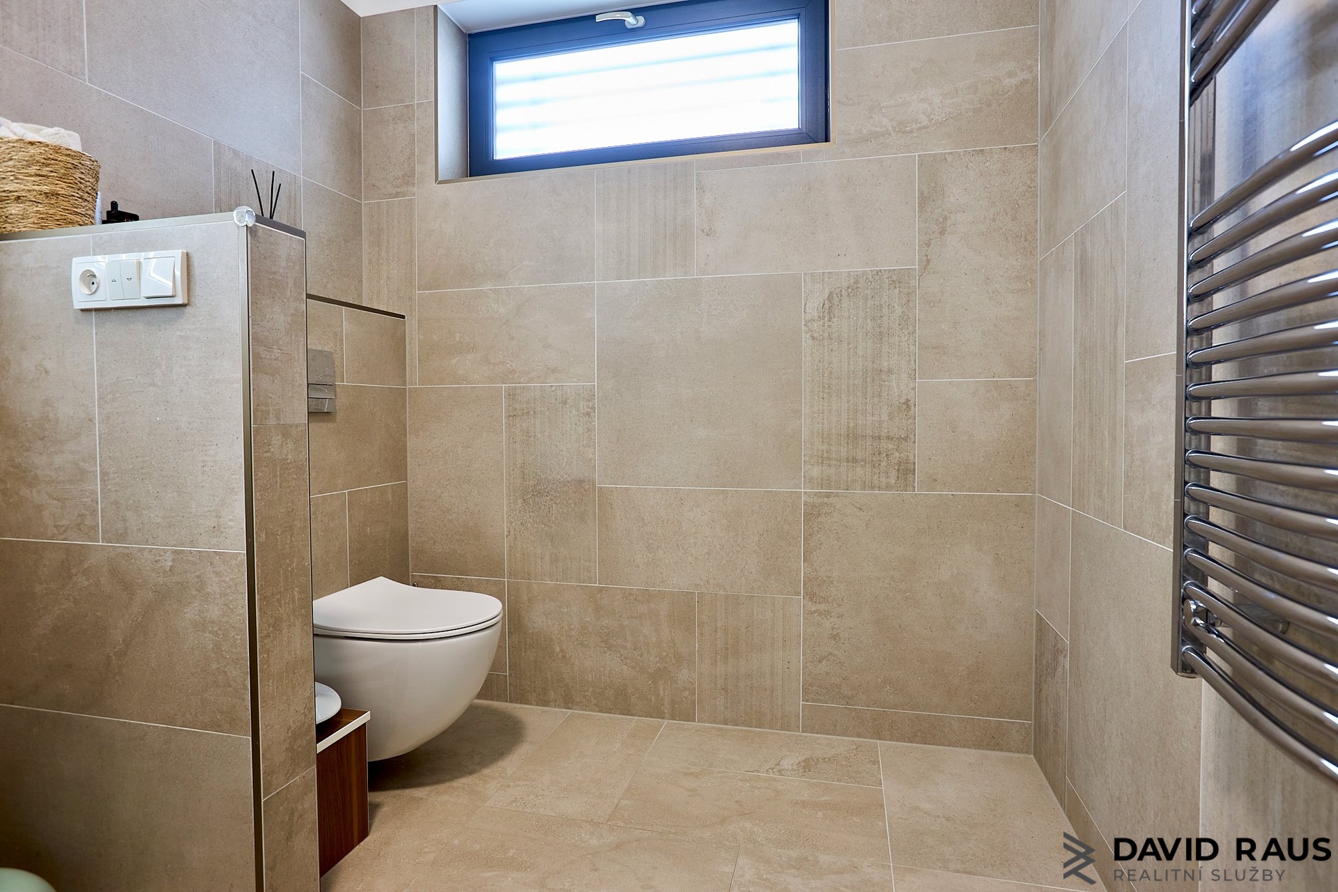 Ložnice i dětský pokoj mají francouzská okna se vstupem přímo na zahradu. Interiér je laděn do přírodních, světlých tónů – vinylové podlahy v béžovo-šedé barvě, bílé stěny, designové koupelny a tapeta s kapradím v ložnici vytváří moderní a útulnou atmosféru.