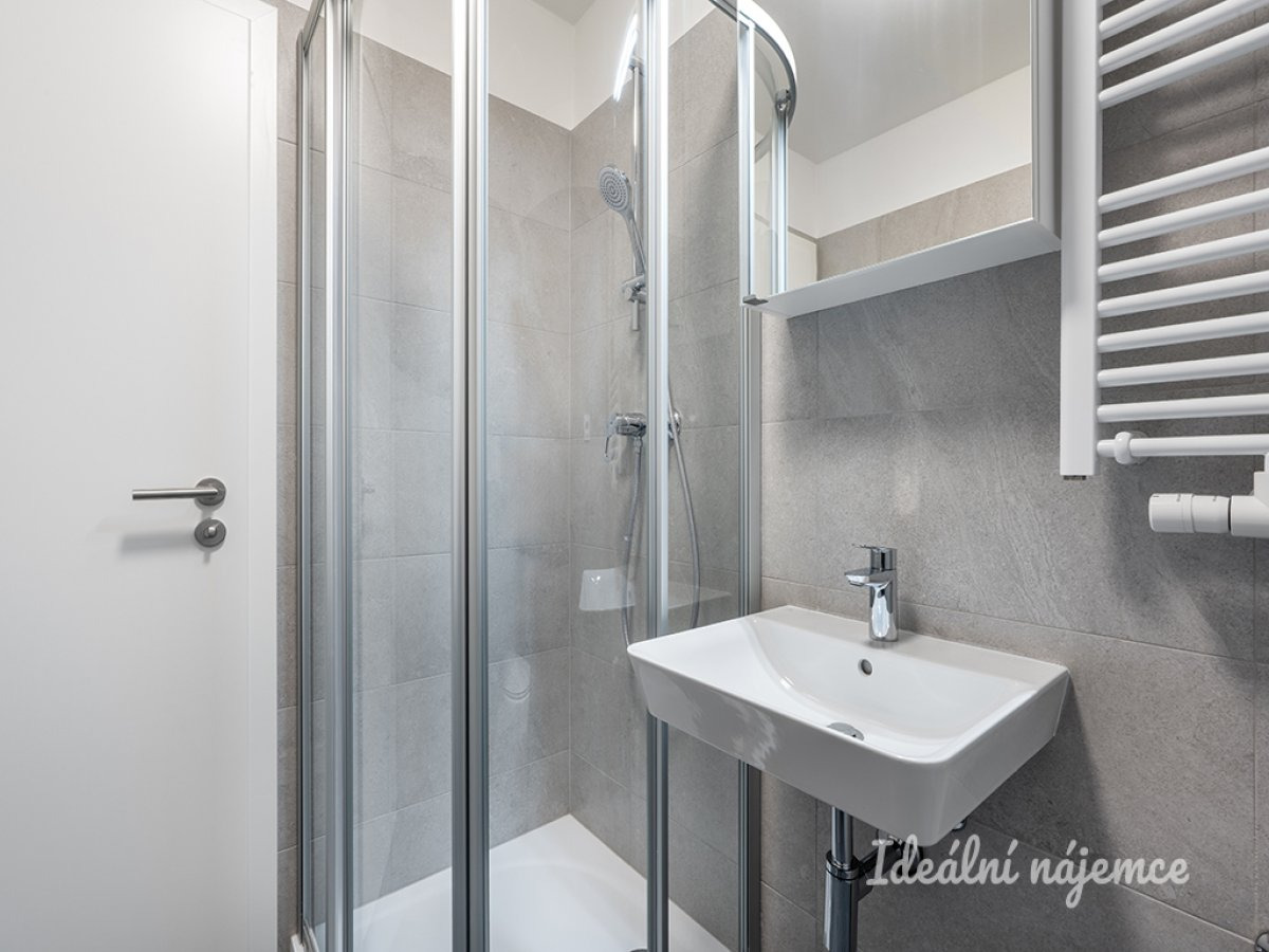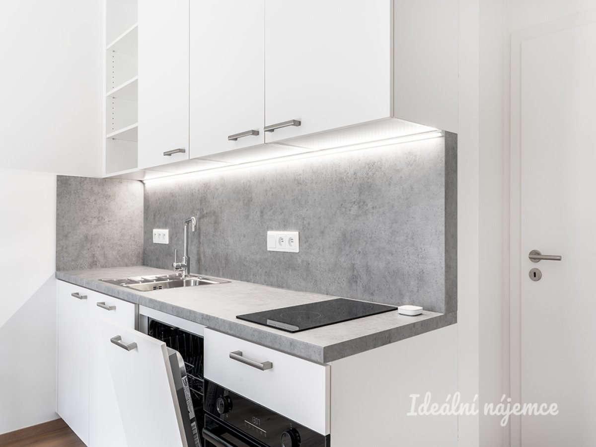 Kuchyňská linka je plně vybavená spotřebiči – indukční varná deska, trouba s horkovzduchem, myčka (šířka 60 cm) a lednice. Po dohodě je možné zdarma byt dovybavit postelí nebo gaučem a pračkou.
