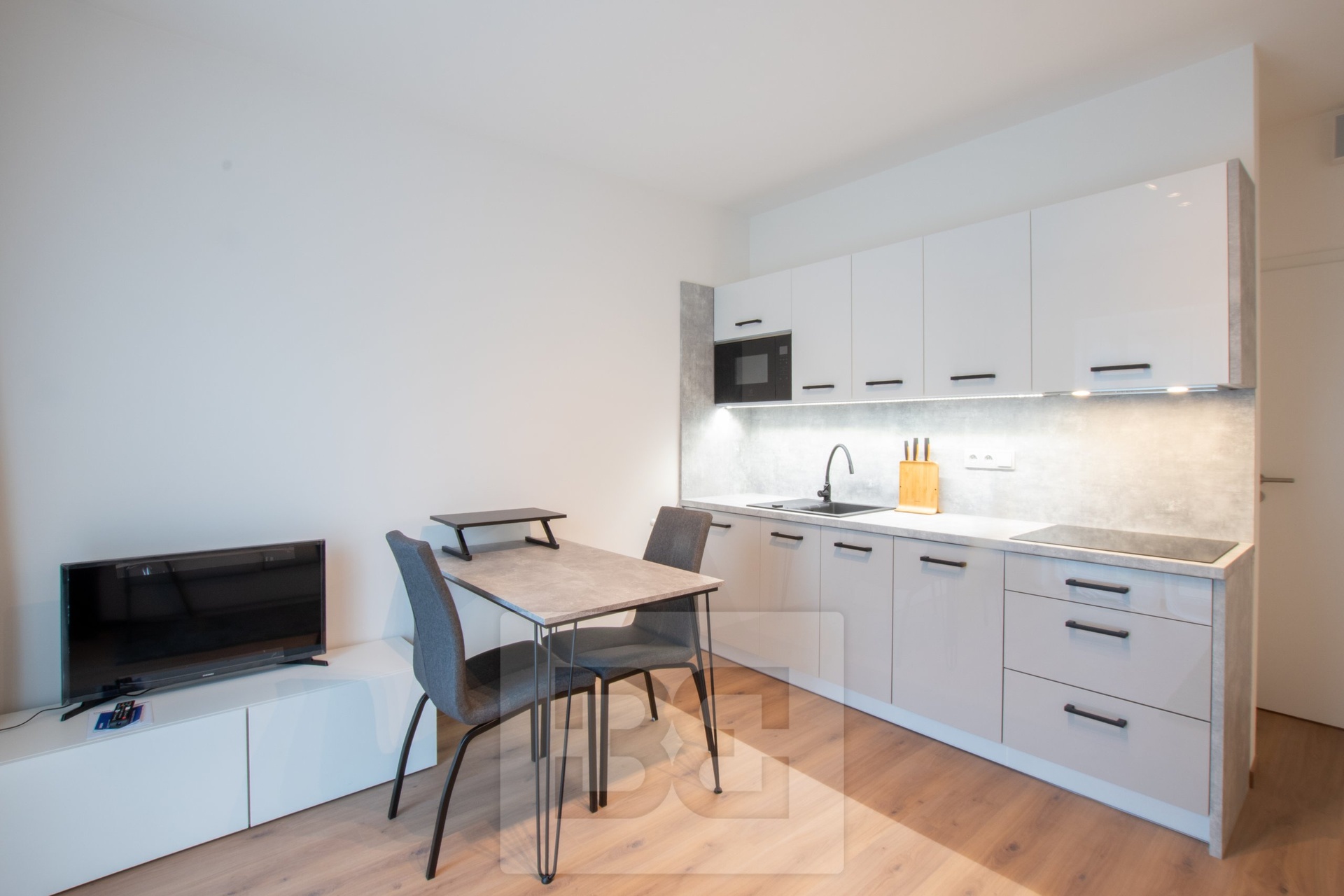 Nabízíme k pronájmu krásný, moderní byt o dispozici 1+kk a ploše 22 m², umístěný ve 2. nadzemním podlaží právě dokončené budovy v projektu Zelené údolí. Byt je kompletně vybaven – v kuchyňské části najdete moderní kuchyňskou linku se spotřebiči, mezi které patří lednice s mrazákem, indukční varná deska, trouba, digestoř a myčka. Obývací část je zařízena rozkládací pohovkou s matrací, vestavěnou skříní, jídelním stolem a televizí. Koupelna je vybavena sprchovým koutem, toaletou a pračkou. V předsíni je k dispozici další vestavěná šatní skříň.