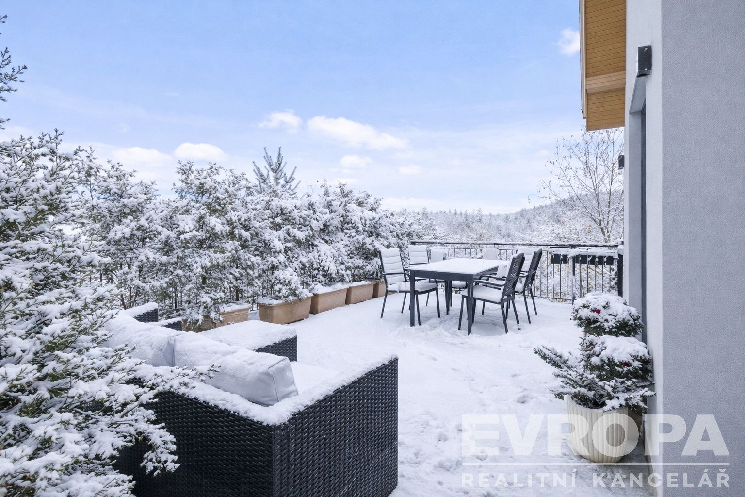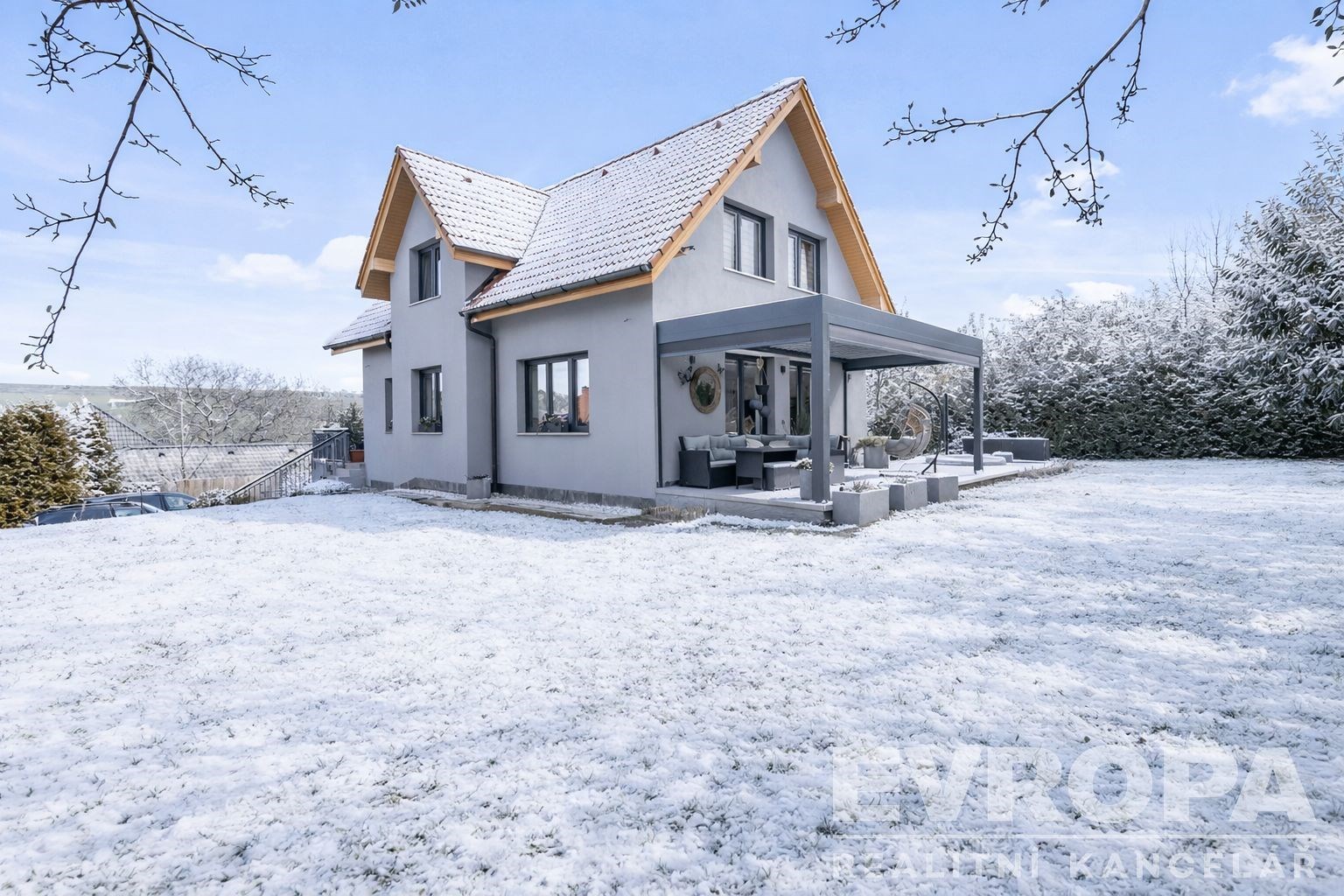 Pozemek se vzrostlými stromy, keři a okrasnou zahradou zaručuje naprosté soukromí a ničím nerušený výhled do údolí. Parkování je zajištěno v garáži a na čtyřech venkovních stáních na vlastním pozemku u domu.