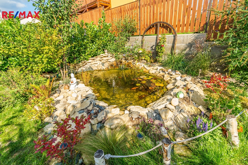 Nemovitost sestává z rodinného domu o dispozici 4+kk (96 m2) , samostatně stojící garáže s montážní jámou (20 m2), zastřešené terasy (15 m2), přírodního jezírka, zahradního domku a polozapuštěného venkovního bazénu. Bazén i jezírko disponují čistícím a filtračním zařízením. Na první pohled Vás osloví pečlivě udržovaná zahrada kolem domu, citlivě kombinující okrasné a užitkové prvky.