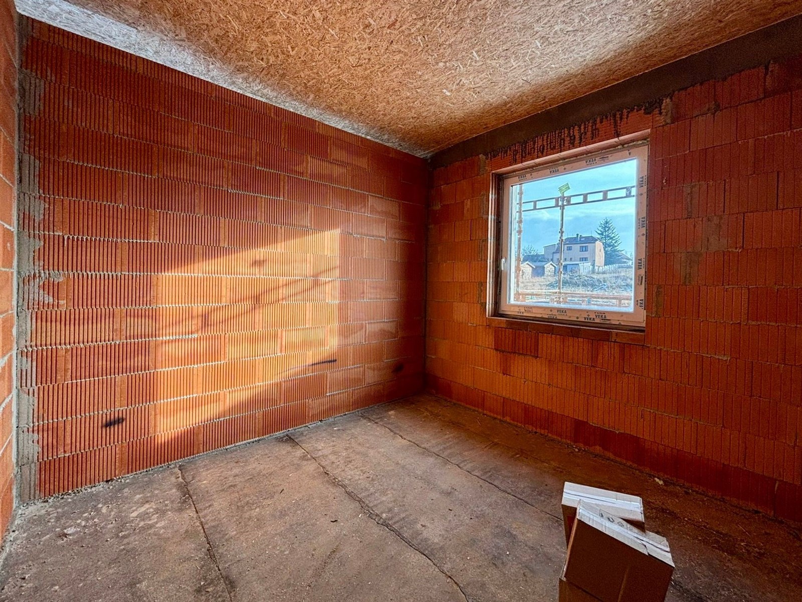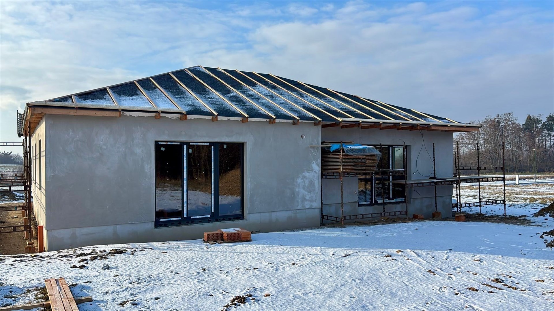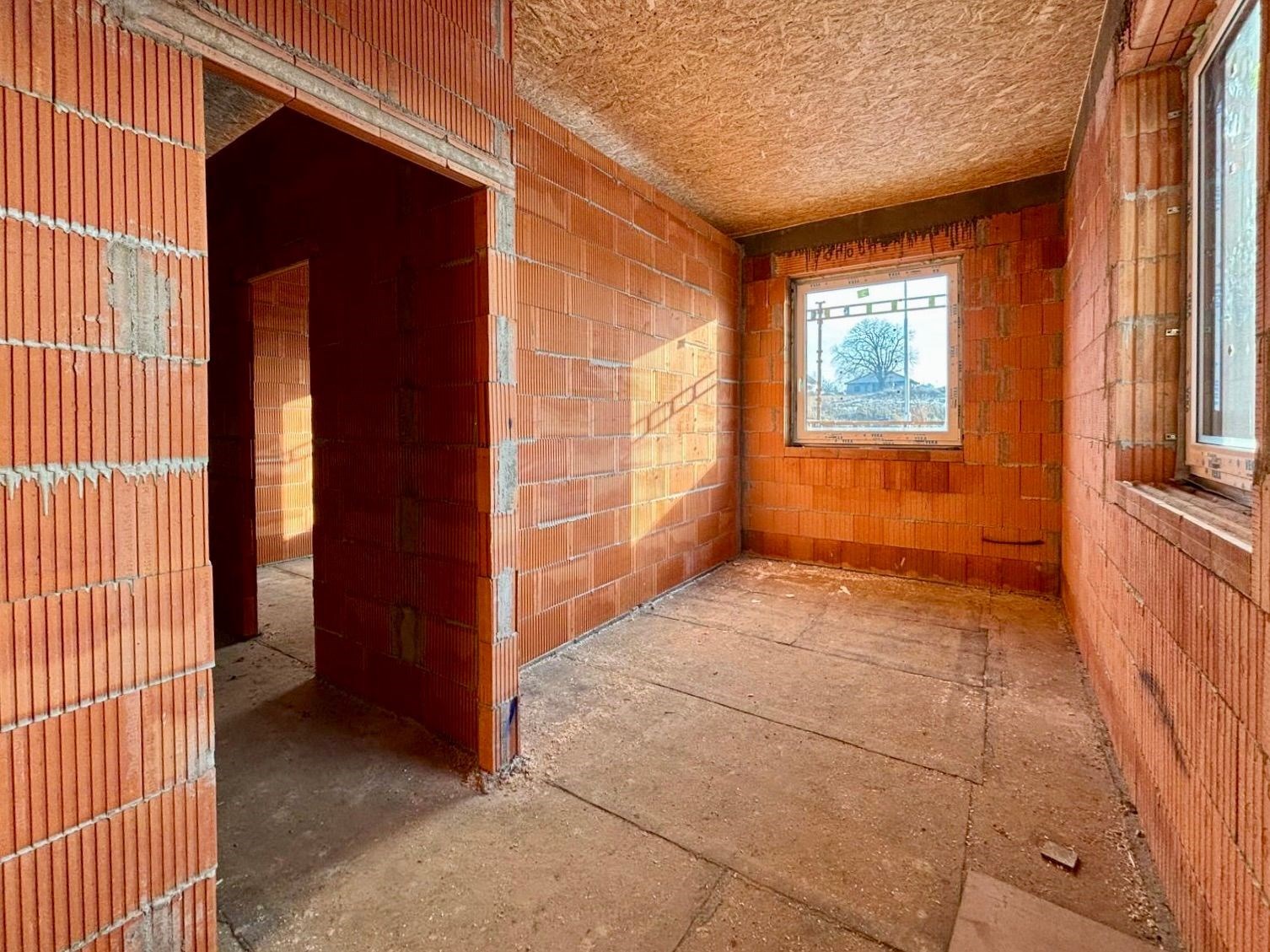 Dům bude předán s kompletním exteriérem a interiérem ve fázi hotových omítek, bez podlah, obkladů, sanity a interiérových dveří. Díky tomu si ho můžete doladit přesně podle svého vkusu.