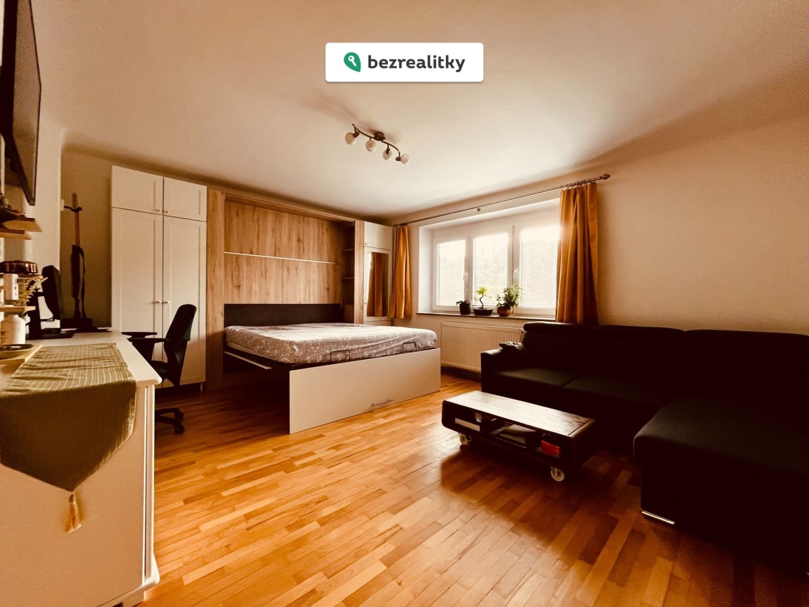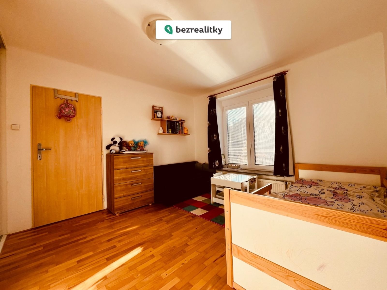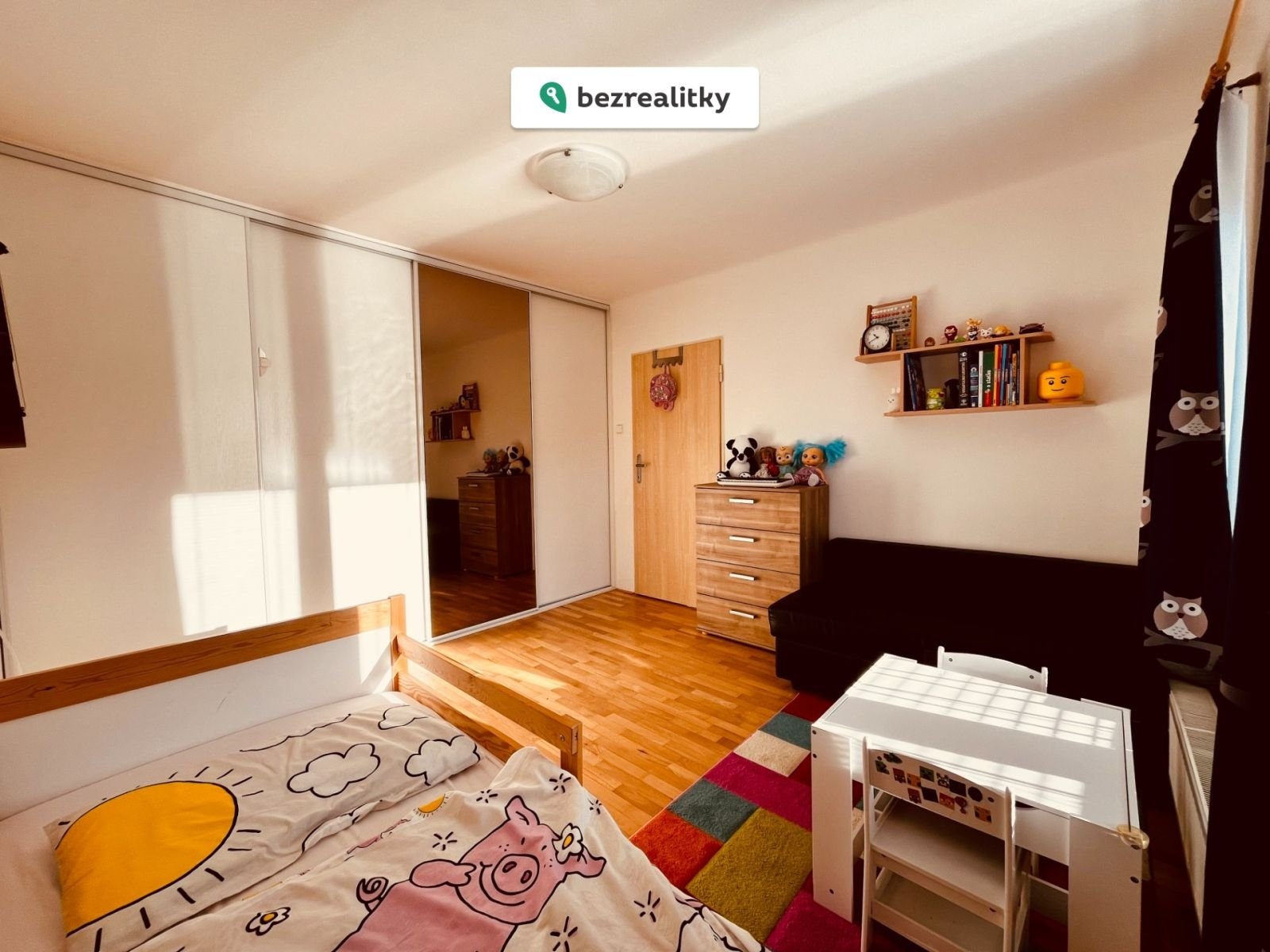 Byt je v současné době zařízen prakticky pro rodinu s dítětem – v obývacím pokoji je výklopná postel, která umožňuje proměnu prostoru podle potřeby.