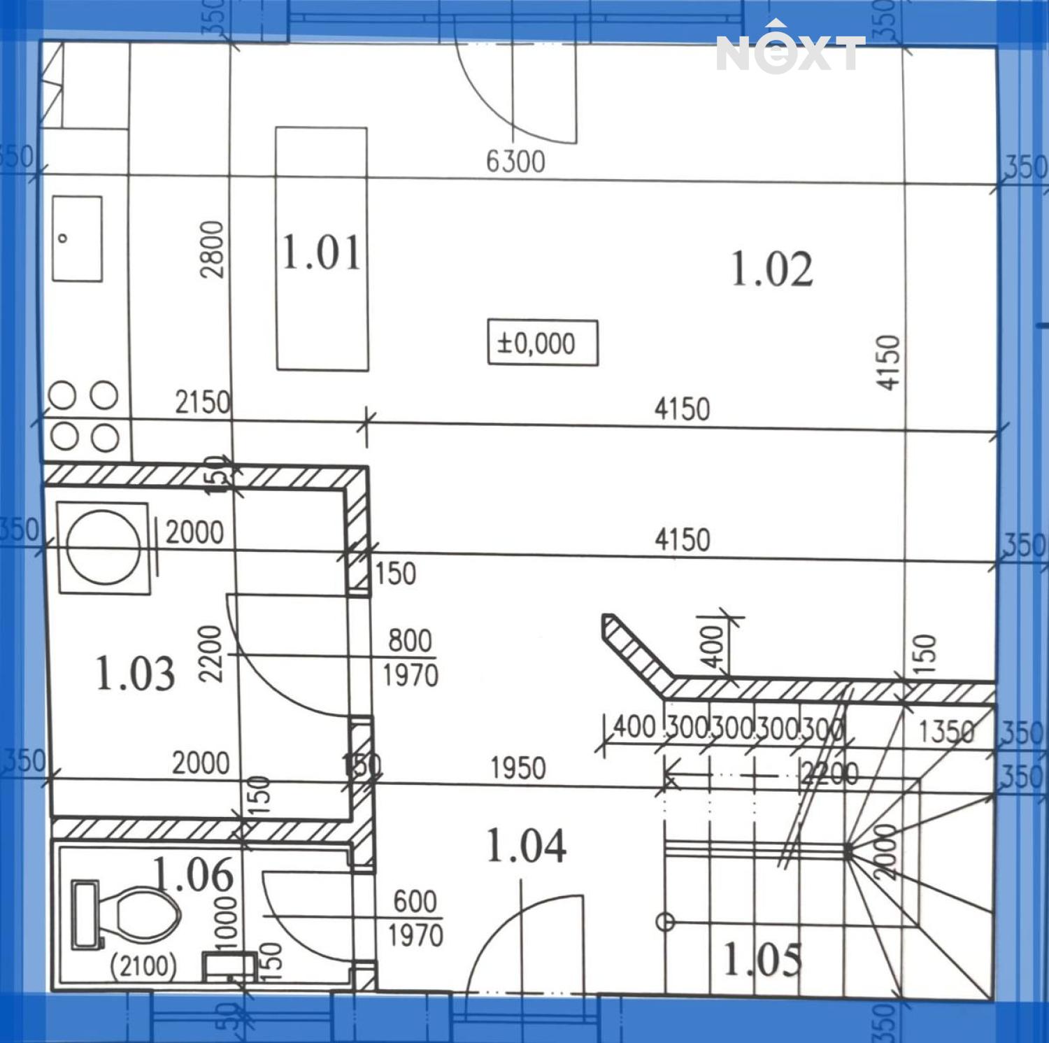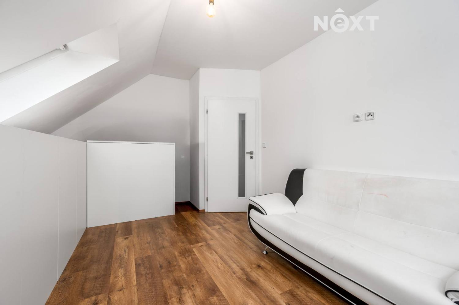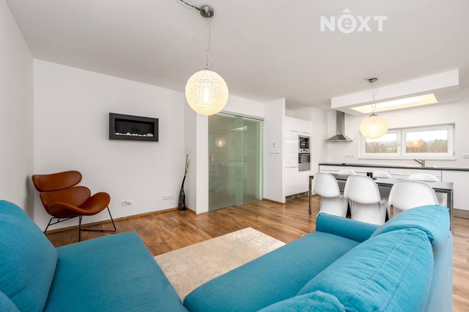 Přízemí: Dominantou je útulný obývací pokoj s přímým vstupem na terasu, propojený s minimalistickou bílou kuchyní vybavenou vestavnými spotřebiči a jídelní částí. V přízemí se dále nachází toaleta s designovou mozaikou a technická místnost s el. kotlem a úložným prostorem. Prakticky je využito i místo pod schodištěm jako komora.