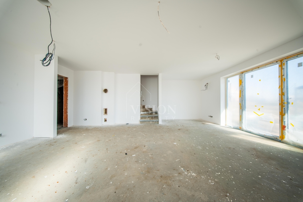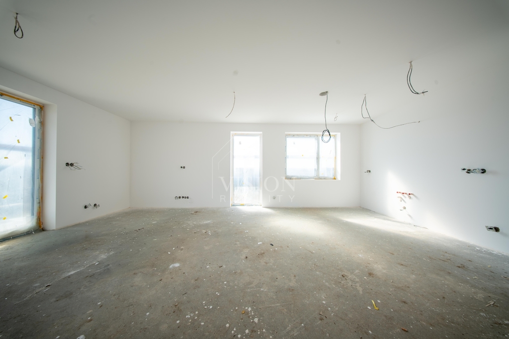 Dominantou domu je velkorysý obývací pokoj s kuchyní, který je díky velkým oknům krásně prosvětlený a přirozeně propojený s terasou a zahradou.