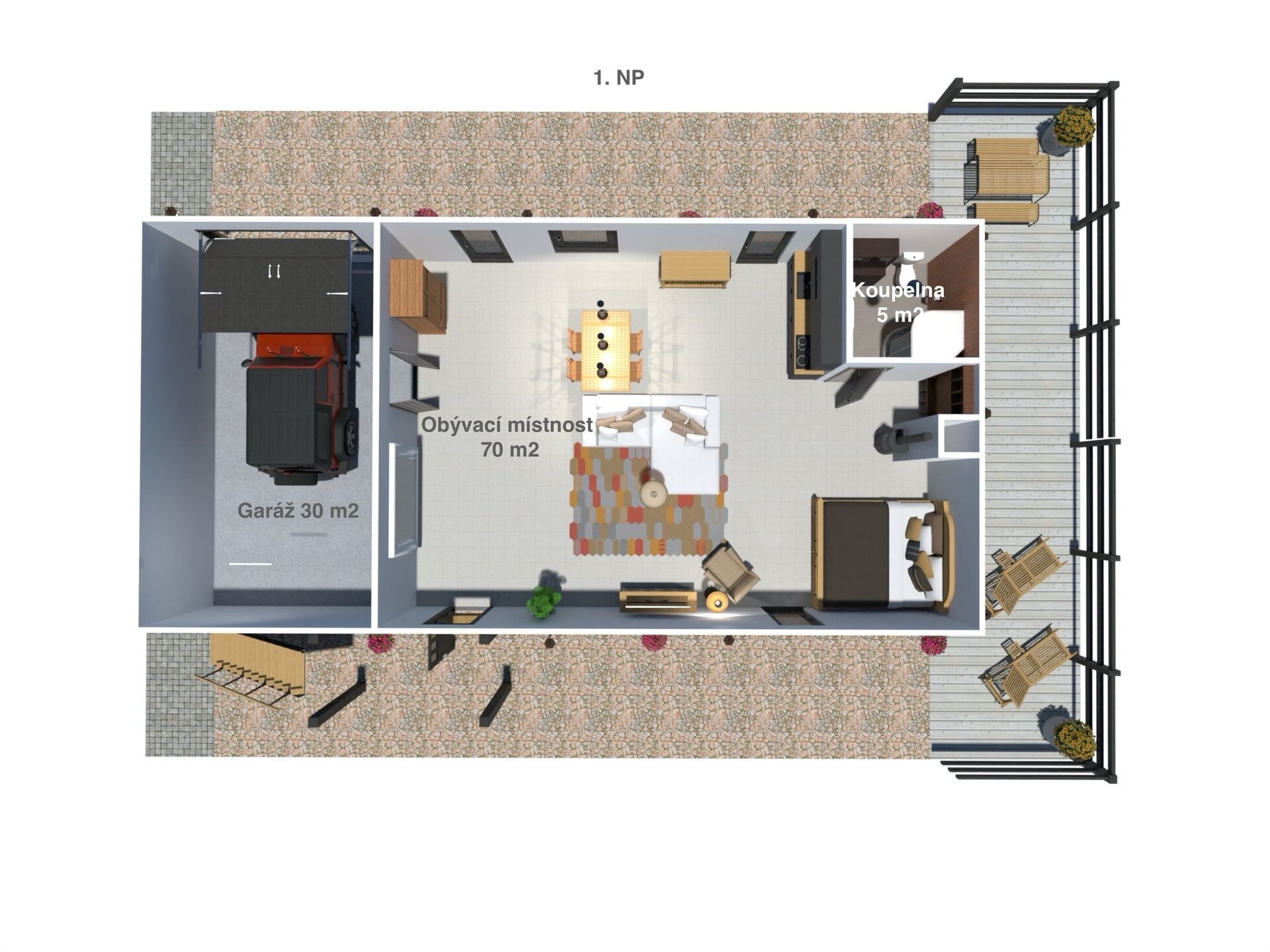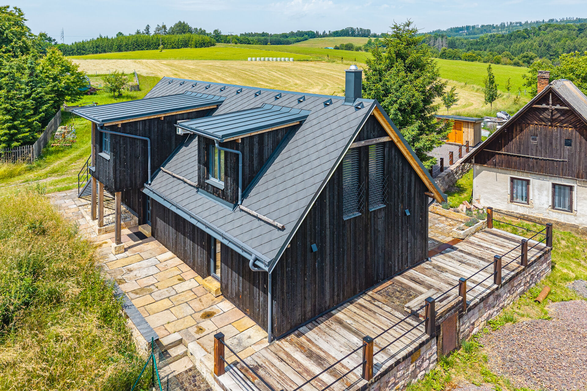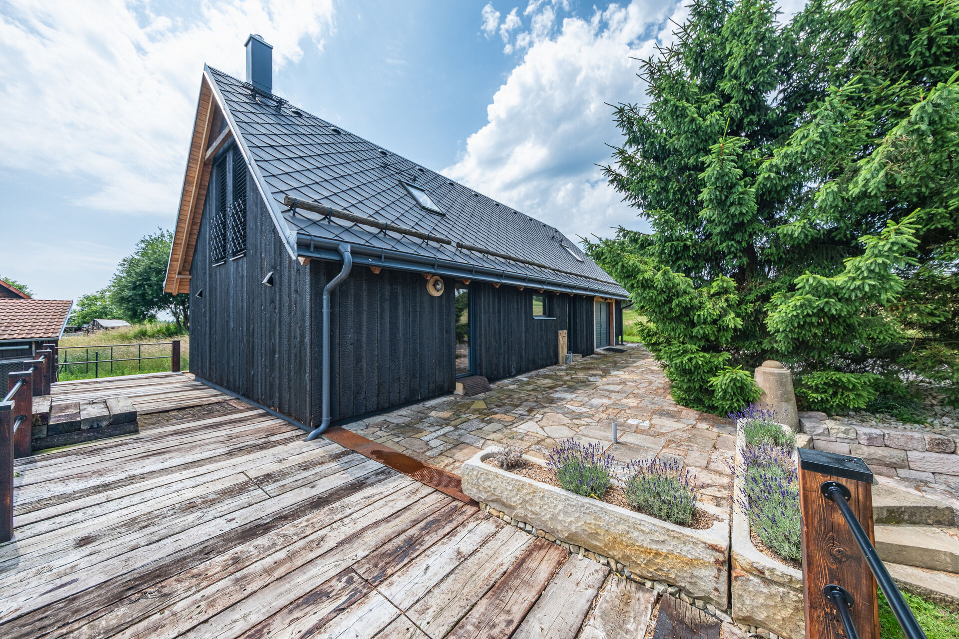 Okolí domu je vkusně upraveno ve stejném duchu a nabízí příjemné zákoutí pro relaxaci.