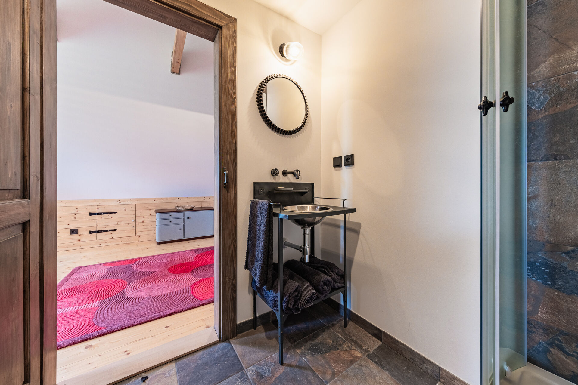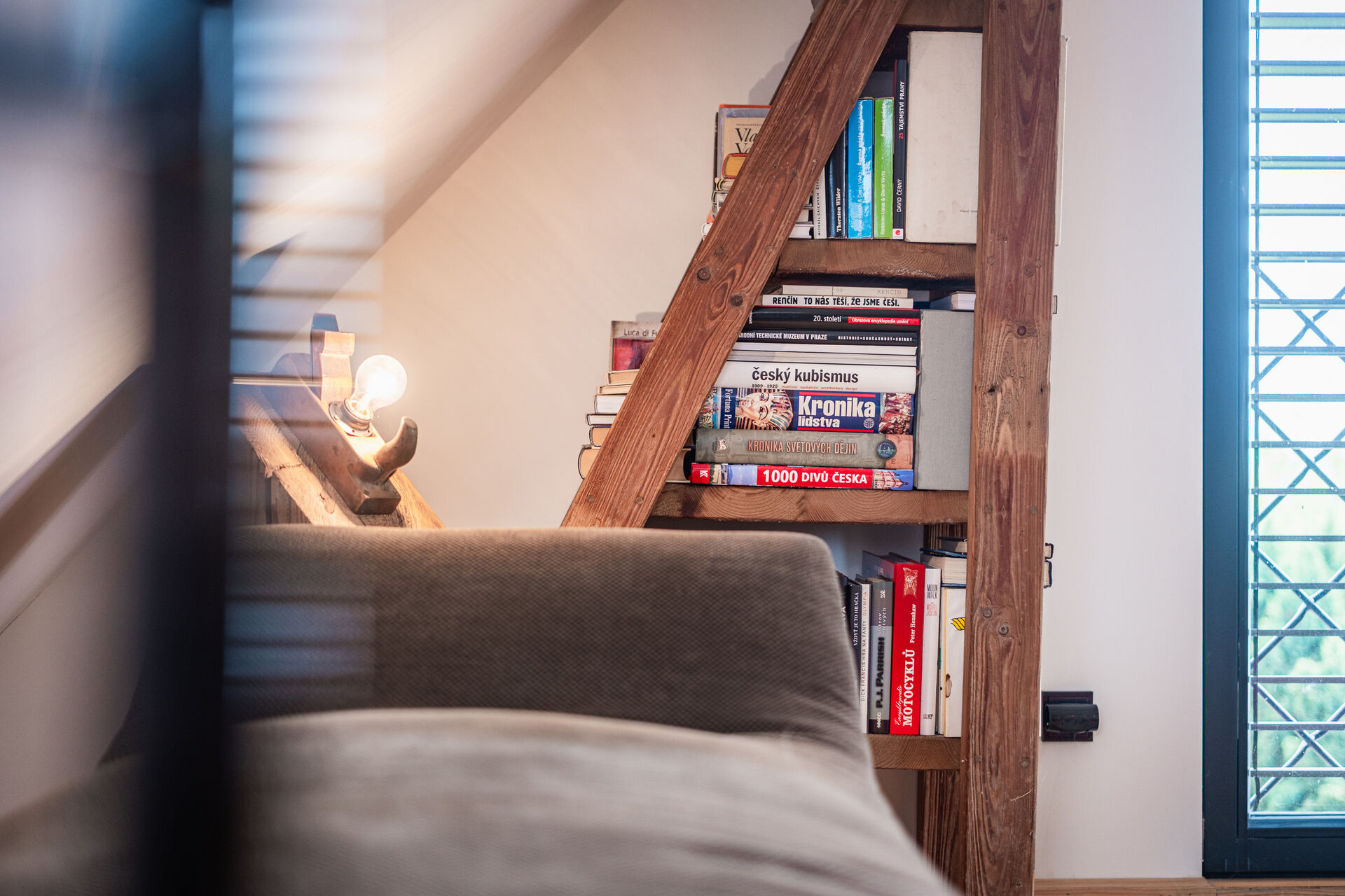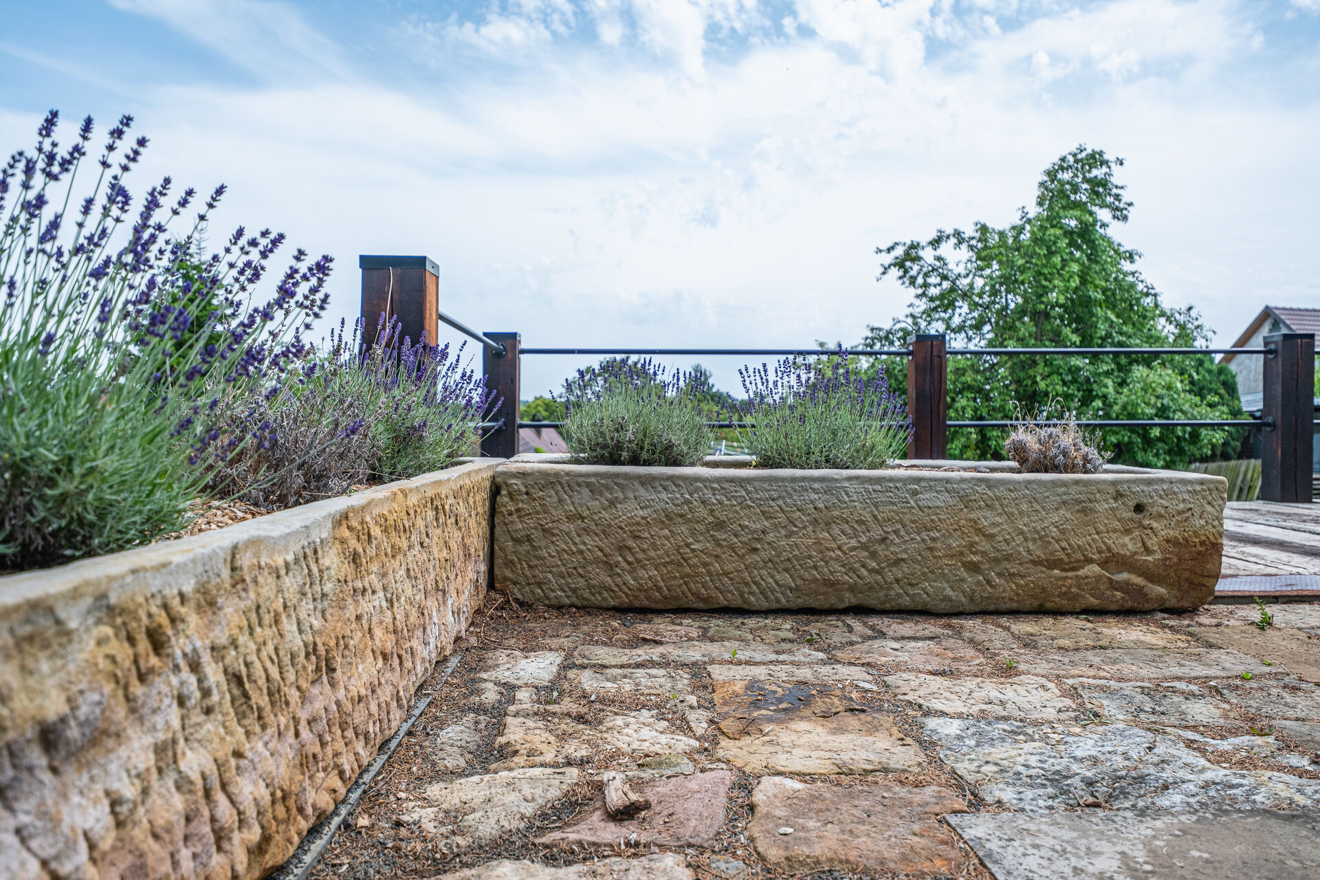 Okolí domu je vkusně upraveno ve stejném duchu a nabízí příjemné zákoutí pro relaxaci.