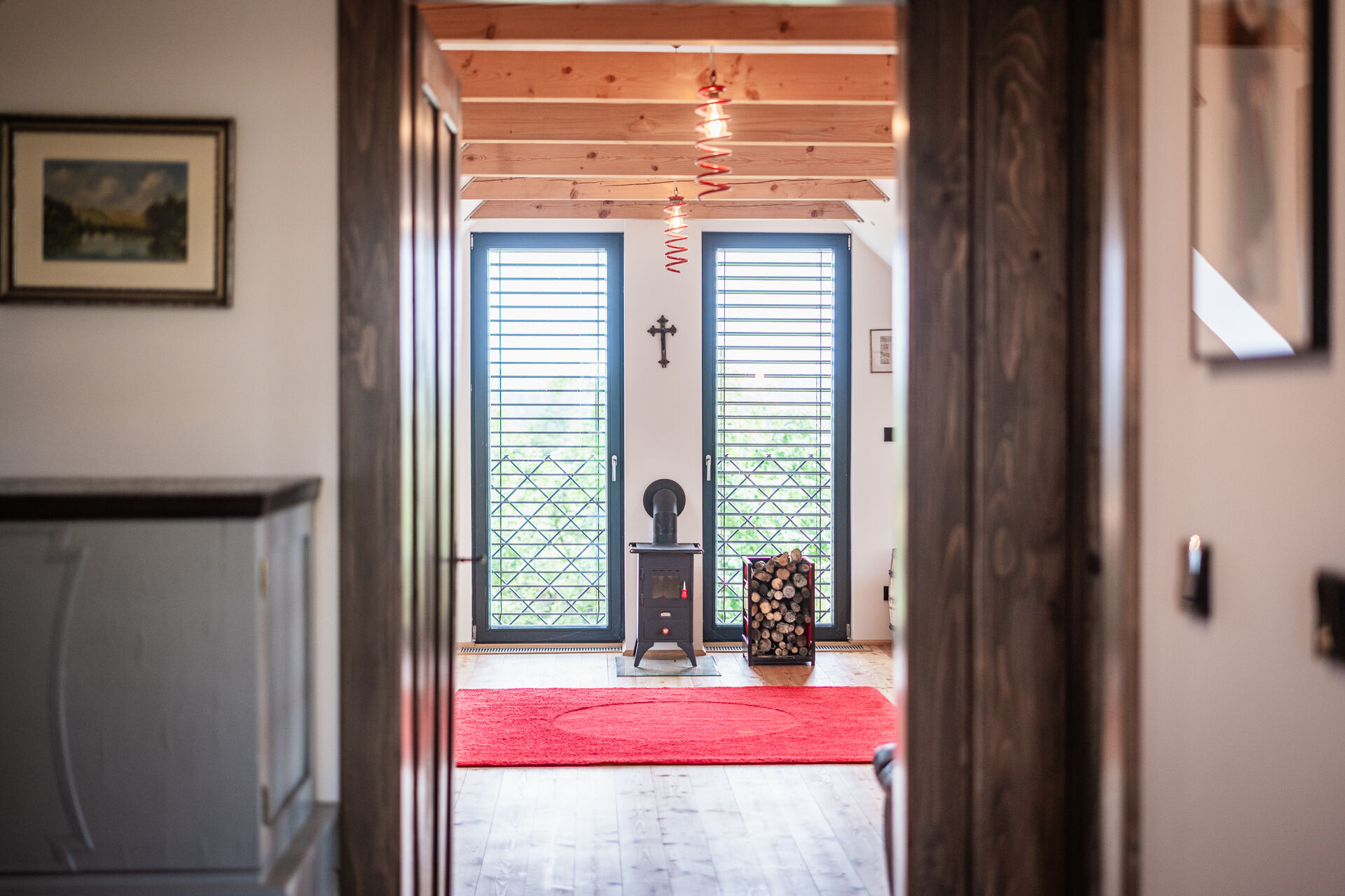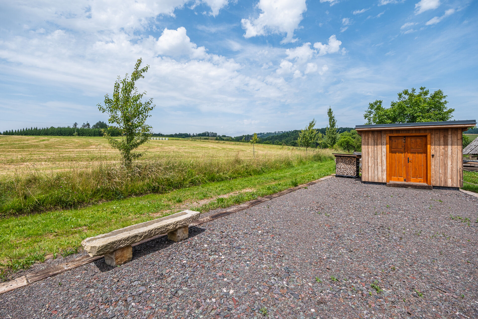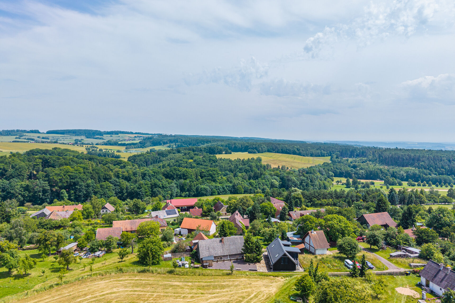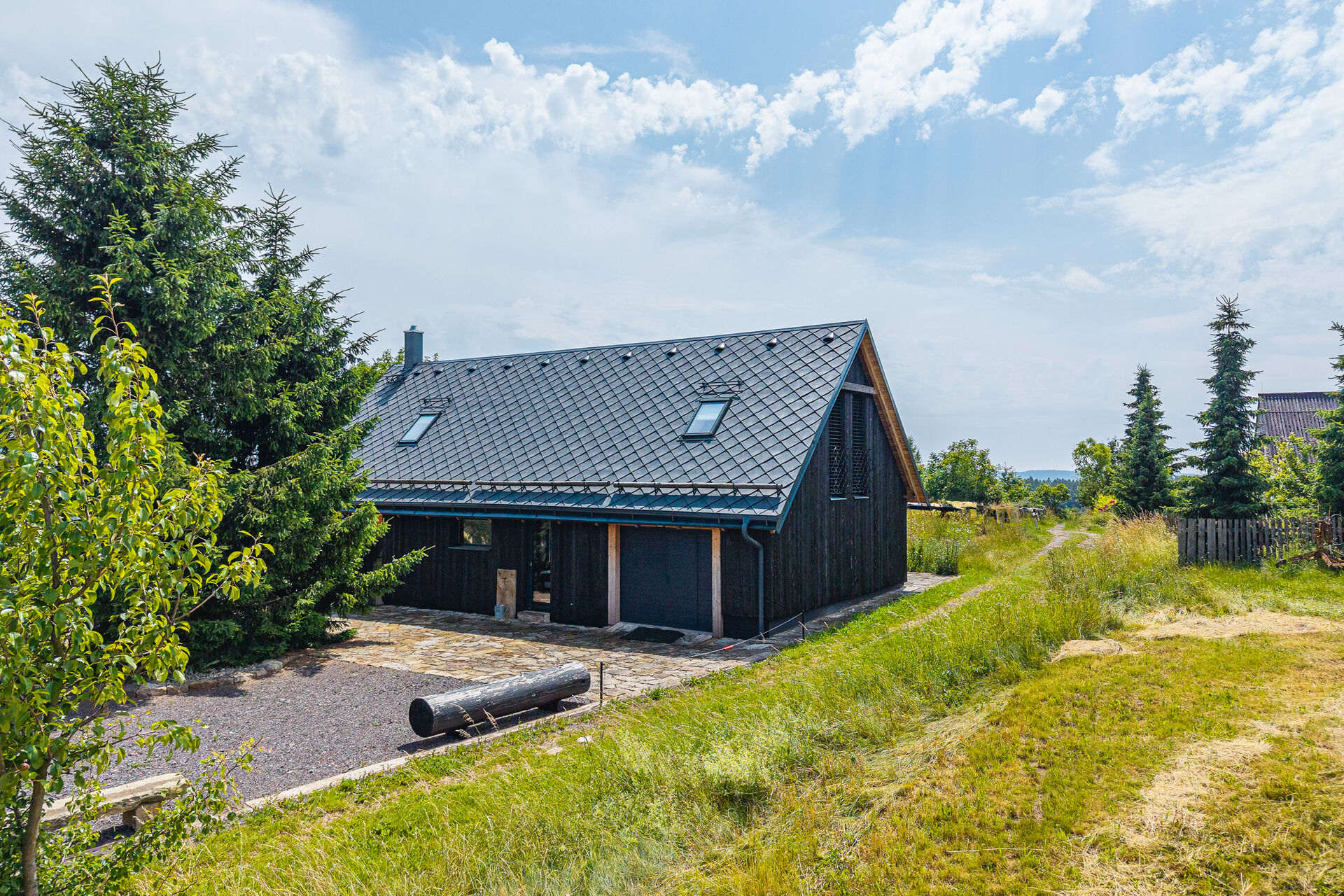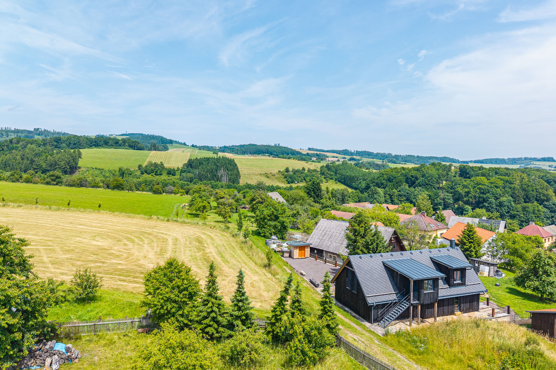 Dům stojí na odlehlém, tichém místě obklopeném poli, loukami a lesy, což zaručuje absolutní klid a kontakt s přírodou.