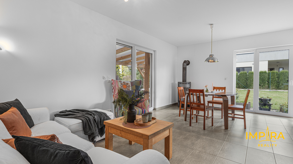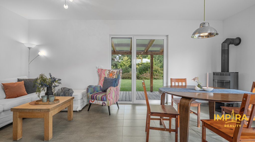 Světlý obývací pokoj s kuchyňským koutem, krbovými kamny a vstupem na zastřešenou terasu