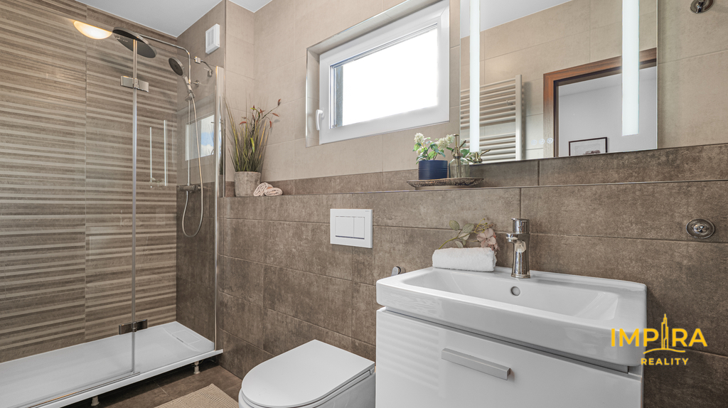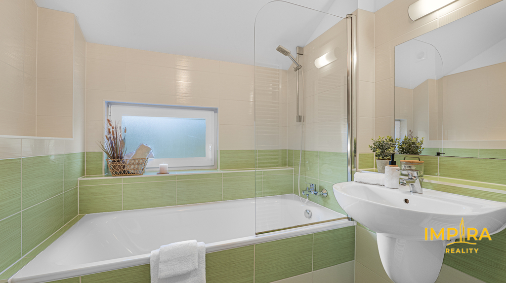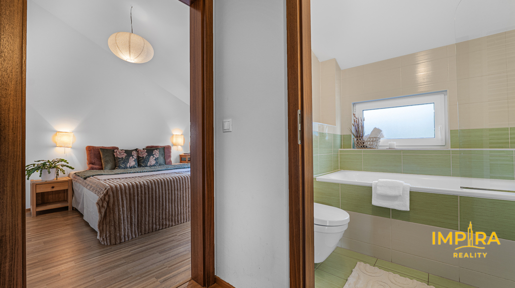 2 koupelny, úložné prostory (vestavěné skříně, komora v patře, šatna v ložnici)