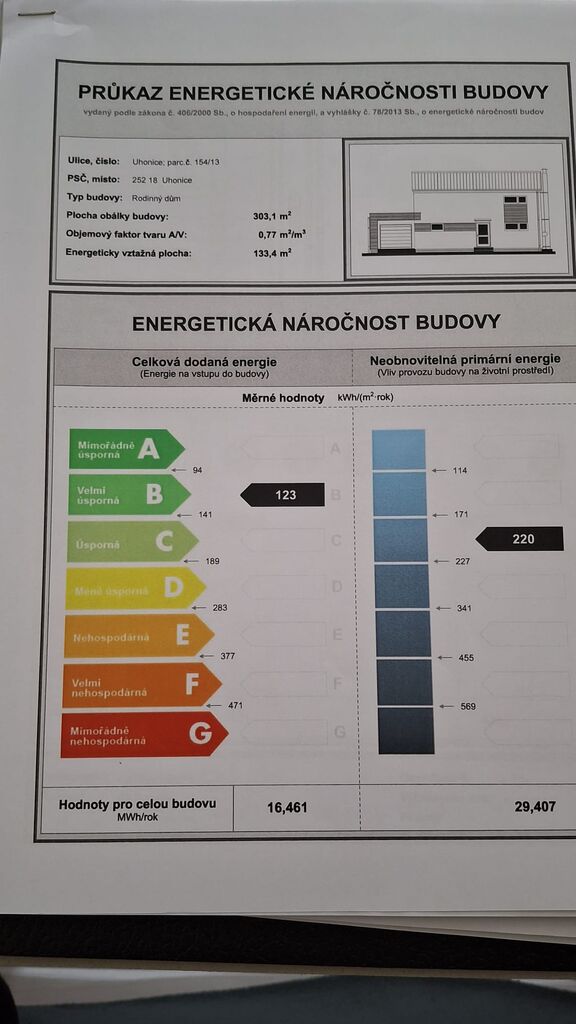 - Ukazatel energetické náročnosti budovy: 123 kWh/m²