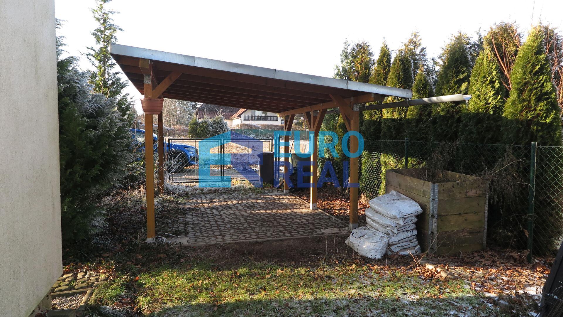 Parkování pro jeden vůz je na pozemku pod zastřešeným přístřeškem. Další místo pak přímo před domem na ulici. Na pozemku je umístěn samostatný domek v podobě zahradního domku, dále terasa navazující na obývací pokoj. V hlavní obytné místnosti v přízemí je funkční krb.
