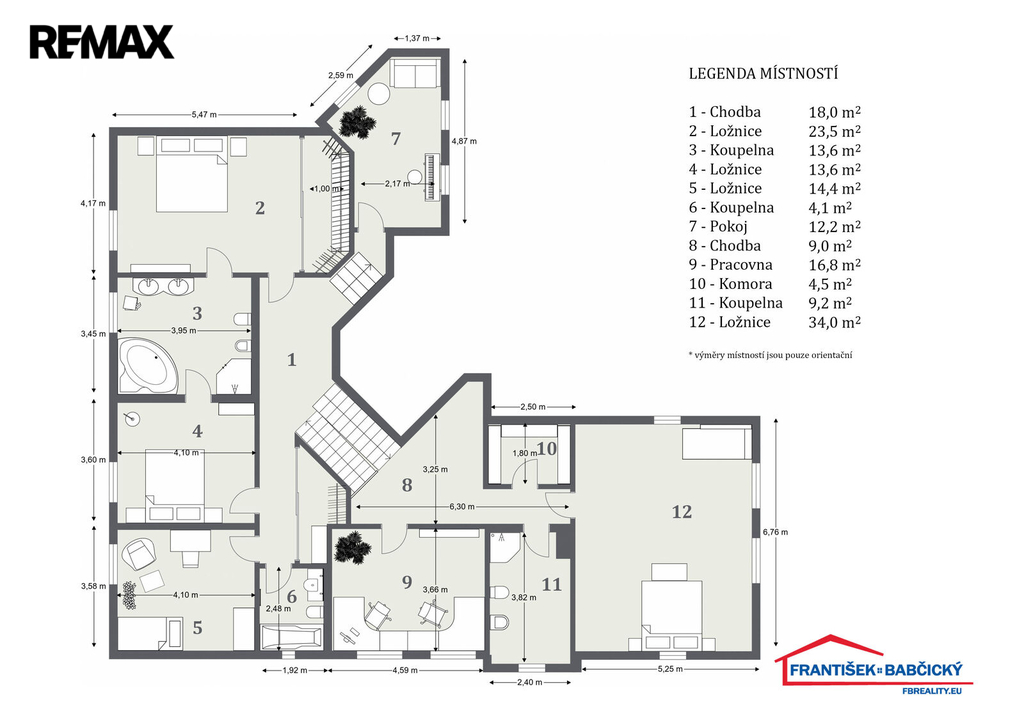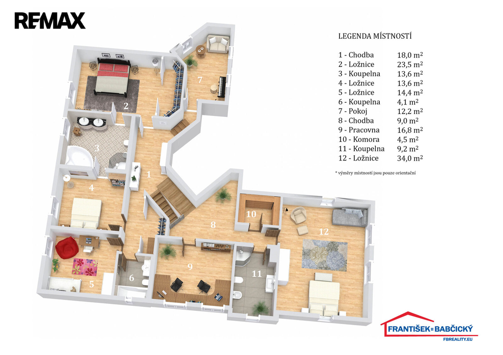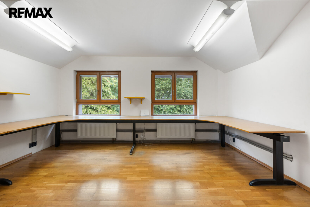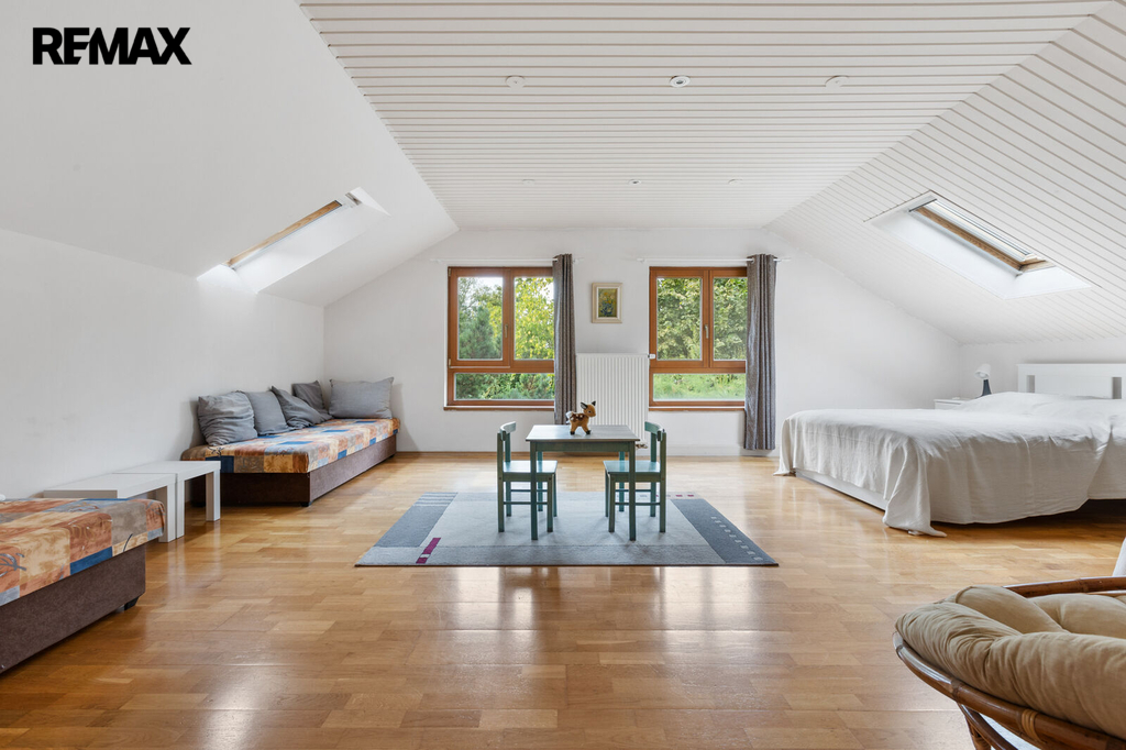 Podkroví tvoří galerie 9 m² se střešními okny, pokoj 34 m², pracovna 15,5 m², koupelna se sprchovým koutem a WC 6,7 m², šatna 11,5 m² a půda s výměrou 74 m².