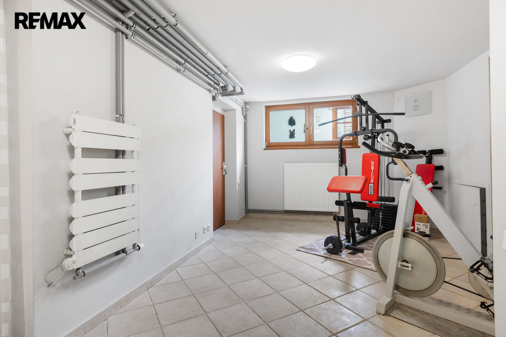 Suterén tvoří dvojgaráž 33,8 m², chodba 8,5 m², posilovna 19 m², sklad 7,5 m², technická místnost 5,6 m², WC 1,5 m² a sauna 4 m², u které je sprchový kout a umyvadlo. Praktická jsou 2 schodiště – jedno přímo do předsíně v přízemí, druhé do relaxační zóny.