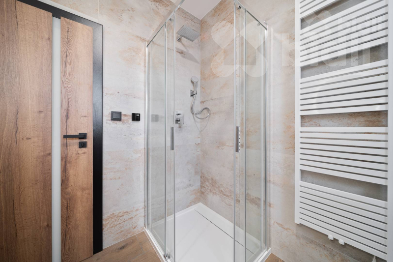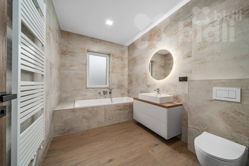 Koupelny jsou provedené ve vysokém standardu: velkoformátové obklady, podomítkové baterie Hansgrohe, keramika Ideal Standard / Vitra, skříňky na míru, zrcadla a elektrická otopná tělesa. Jedna koupelna nabízí sprchu i vanu, druhá nadstandardně velkou vanu + WC.