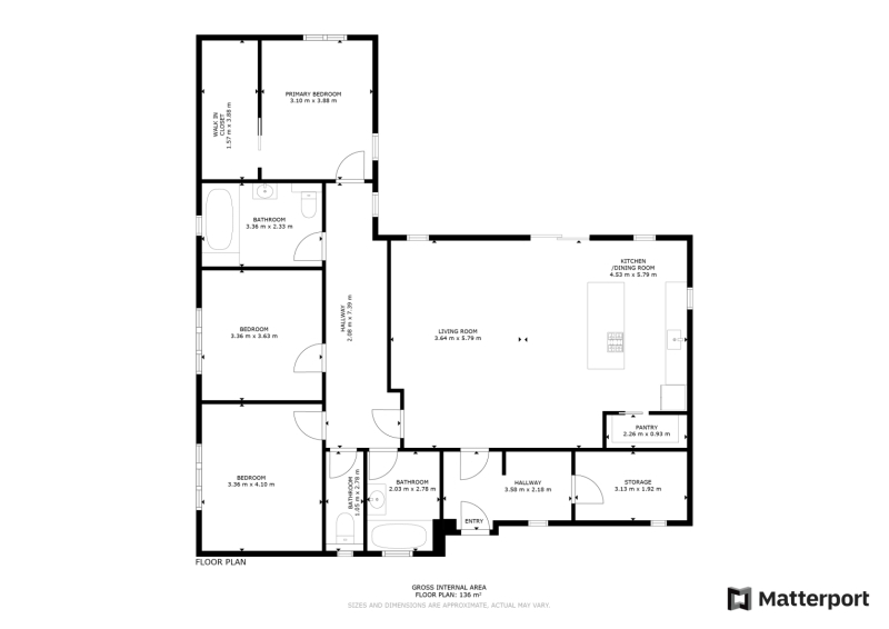 3 samostatné pokoje (ložnice + dva další pokoje), šatna, spíž a technická místnost 2 koupelny + samostatné WC (dispozice je přehledně znázorněna v půdorysu ve fotogalerii).