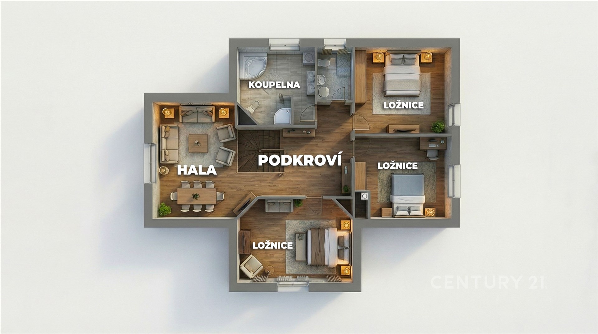 Podkroví domu nabízí tři prostorné pokoje, každý s výměrou přes 20 m², které lze využít jako ložnici a dětské pokoje. Dále je zde komora a velká koupelna s WC. Dominantou horního patra je velkorysá hala o výměře 47 m², kterou lze využít jako domácí kancelář, hernu, relaxační zónu nebo druhý obývací pokoj.