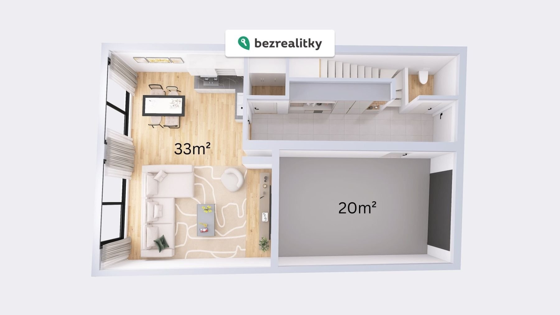Nemovitost má dvě obytné nadzemní podlaží uspořádané velmi systematicky. V 1.NP se nachází velký, plně prosklený obývací pokoj s kuchyňským koutem, osazený francouzským oknem s výstupem na zahradu. Dále je zde prostorná dílna/garáž s vraty na dálkové ovládání, samostatná toaleta a velmi praktická komora. Ve 2.NP jsou tři takřka totožné, prosvětlené obytné místnosti, samostatná šatna, koupelna vybavená prostorným sprchovým koutem a vanou a technická místnost s druhou toaletou. Dalším luxusním úložným prostorem o velikosti 20m2 je půda přístupná sklápěcími schody přímo z chodby. K relaxaci poslouží většinu dne prosluněná zahrádka osazená kobercovým trávníkem o rozloze zhruba 100m2, poskytující naprosté soukromí.