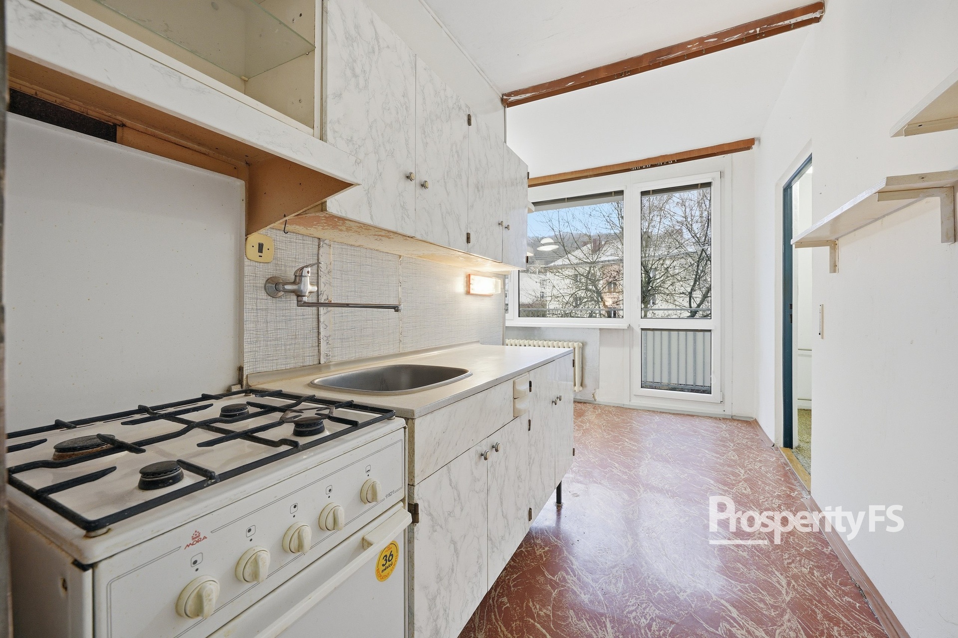 Koupelna je připravena ke kompletní modernizaci a byt dále nabízí praktický úložný prostor v podobě zděné šatny.