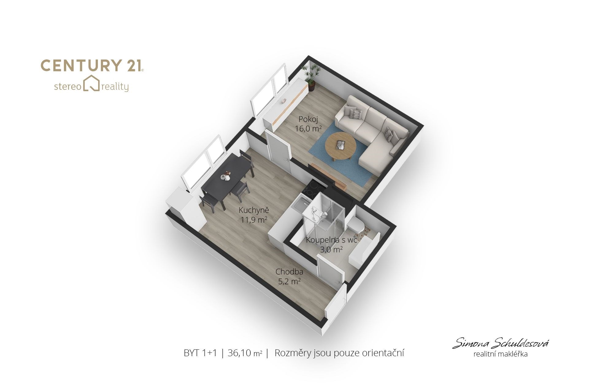 - Celková podlahová plocha: 36 m²