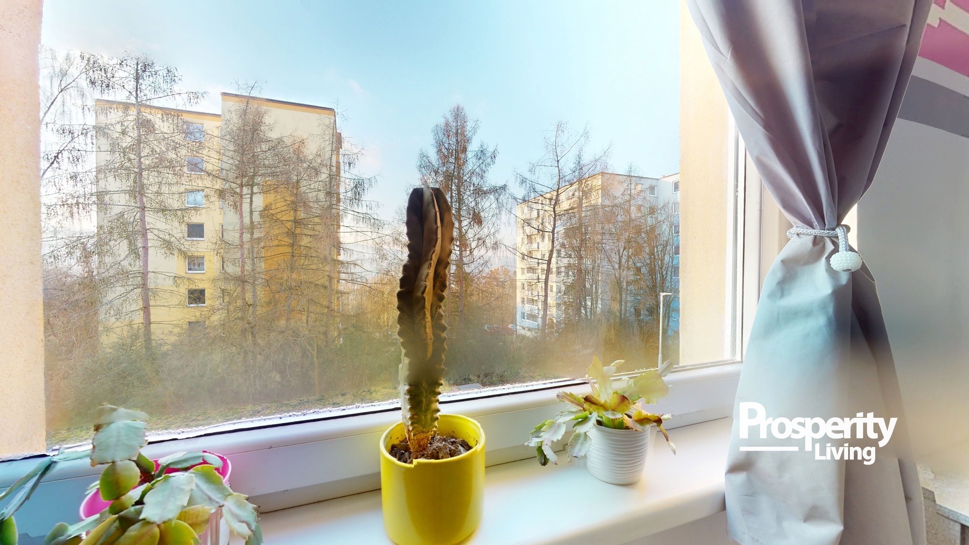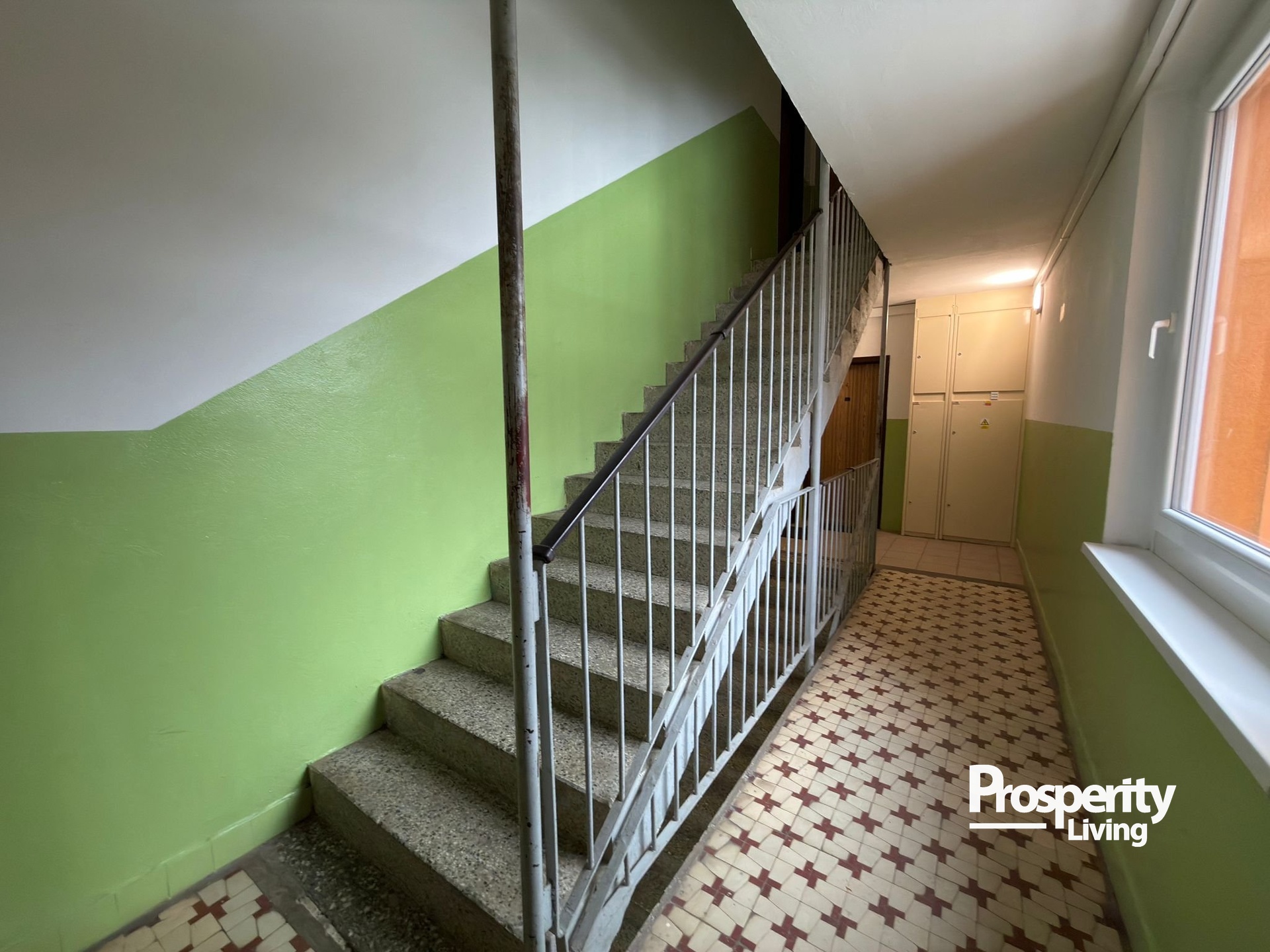Dispoziční řešení bytu nabízí vstupní chodbu, prostorný obývací pokoj s kuchyňským koutem, ložnici a koupelnu s toaletou. Nabízený byt je v původním stavu, má umakartové bytové jádro, plastová okna. Podlahovou krytinu tvoří PVC. Velmi nízké měsíční náklady, lze získat na prohlídce. K bytu náleží sklepní kóje.