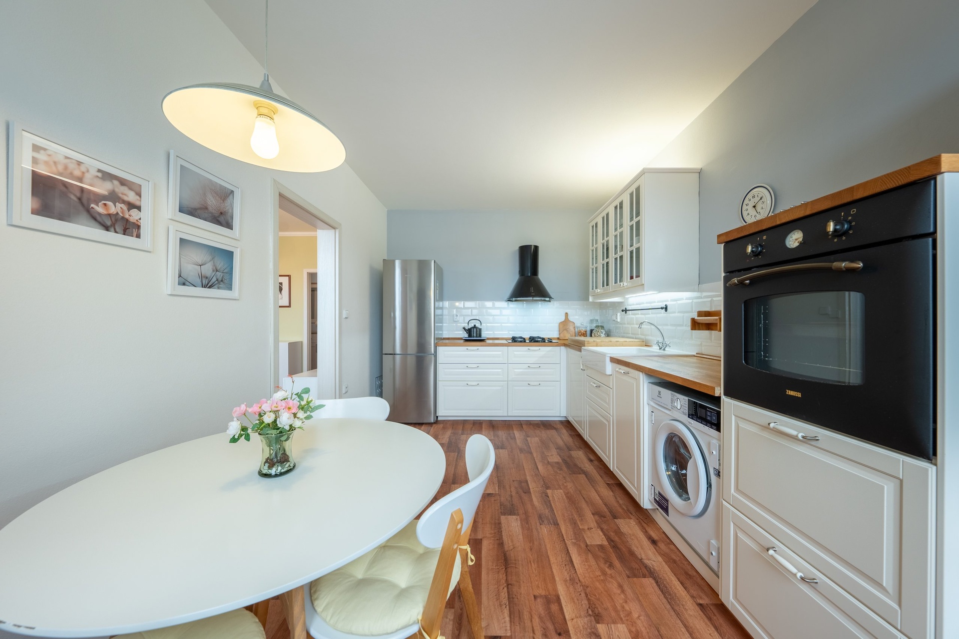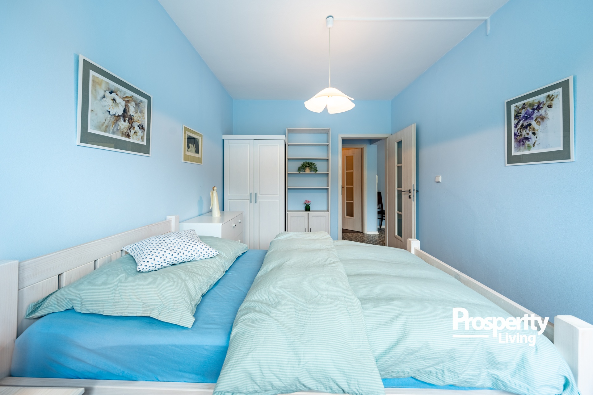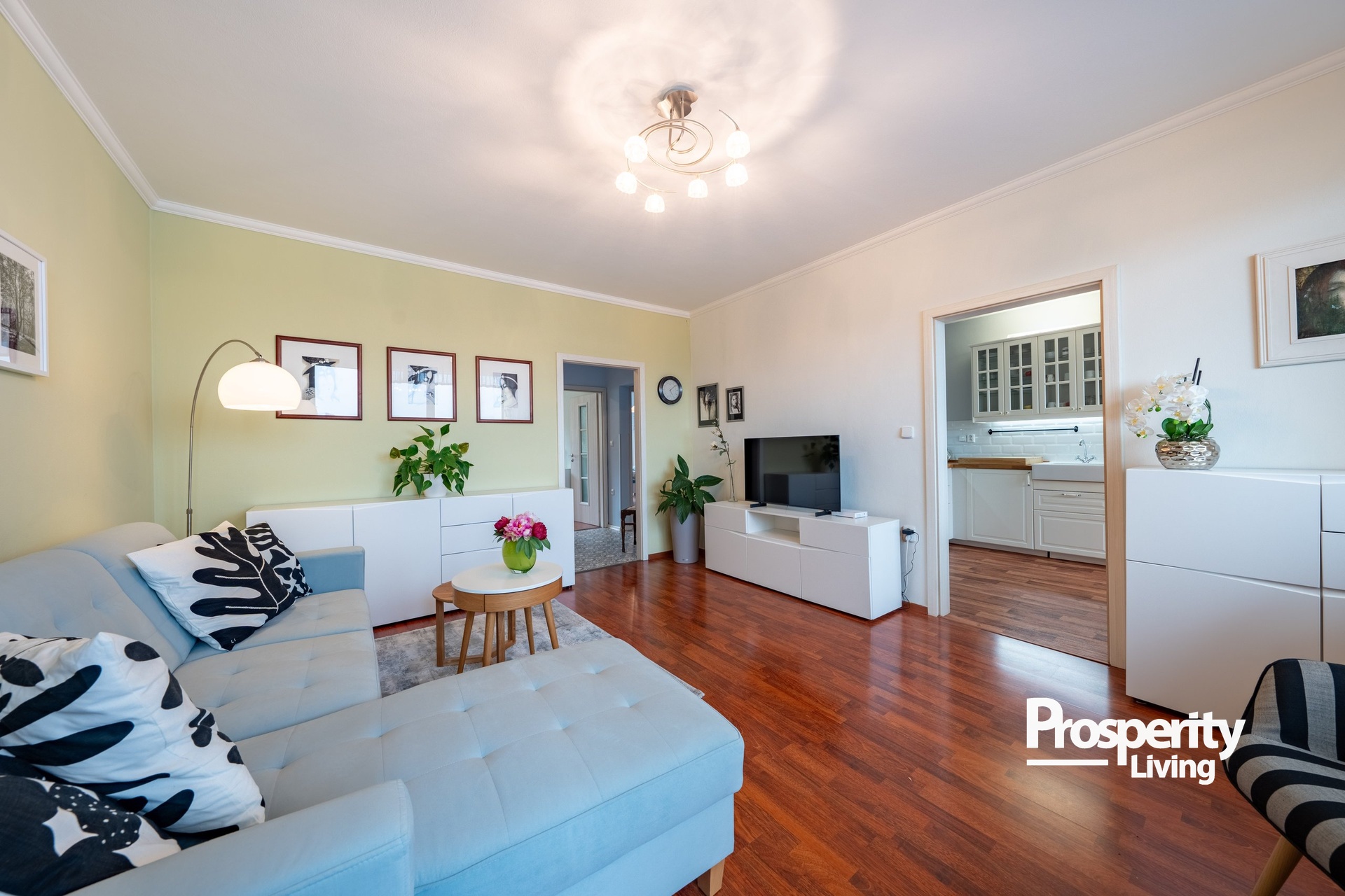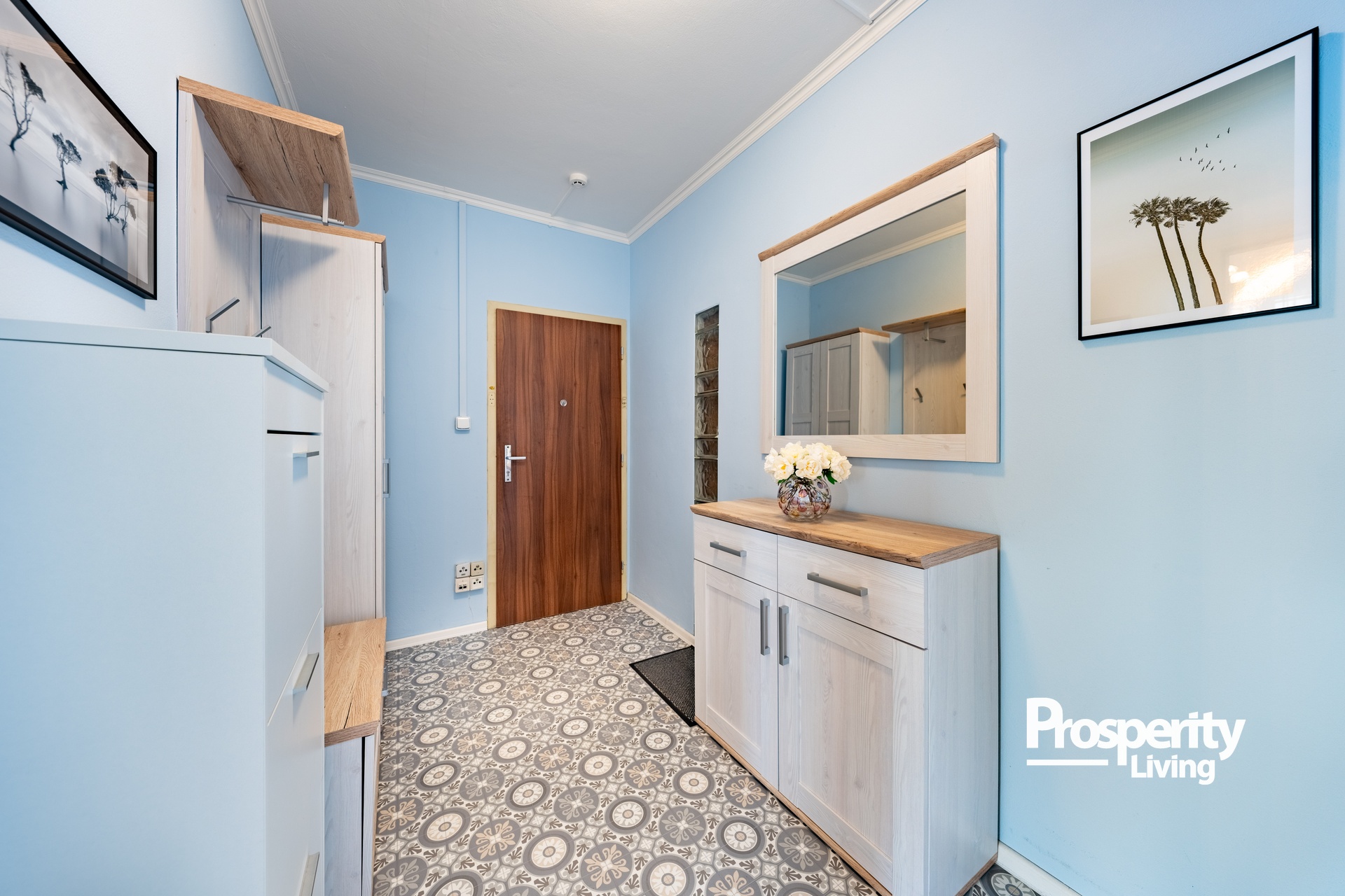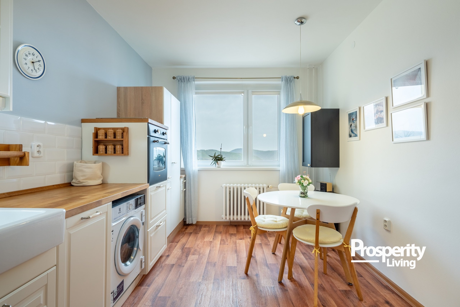 Celková dispozice bytu nabízí prostorný obývací pokoj, samostatnou kuchyni s jídelním koutem, dvě ložnice, předsíň s dostatkem úložných prostor, koupelnu a WC. Kuchyň je vybavena moderní linkou s vestavěnými spotřebiči včetně trouby, digestoře a pračky. Interiér působí svěže a útulně díky kvalitním podlahám, novým dveřím, neutrálním barvám a dostatku denního světla. Byt je částečně zařízený a připravený k okamžitému nastěhování.