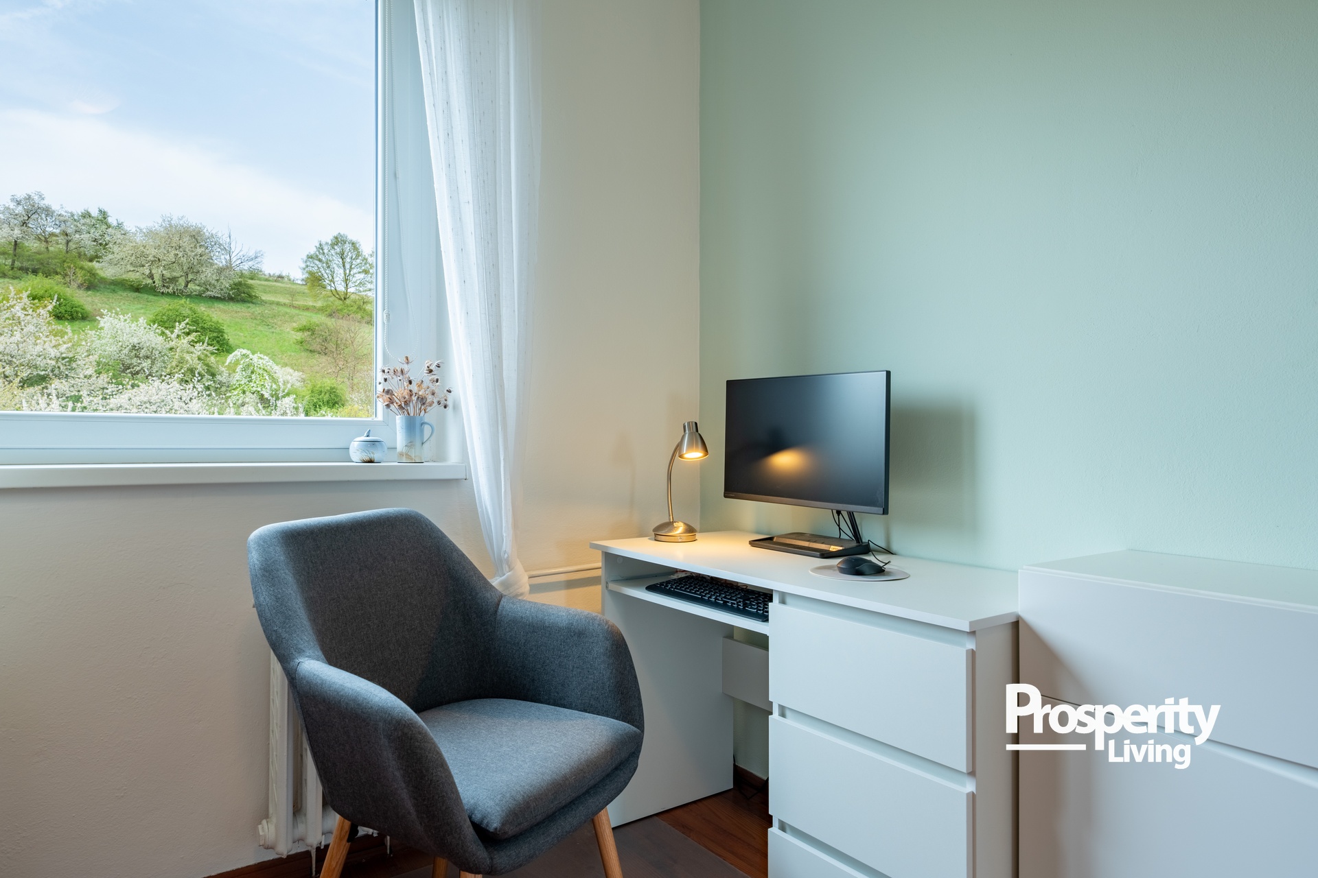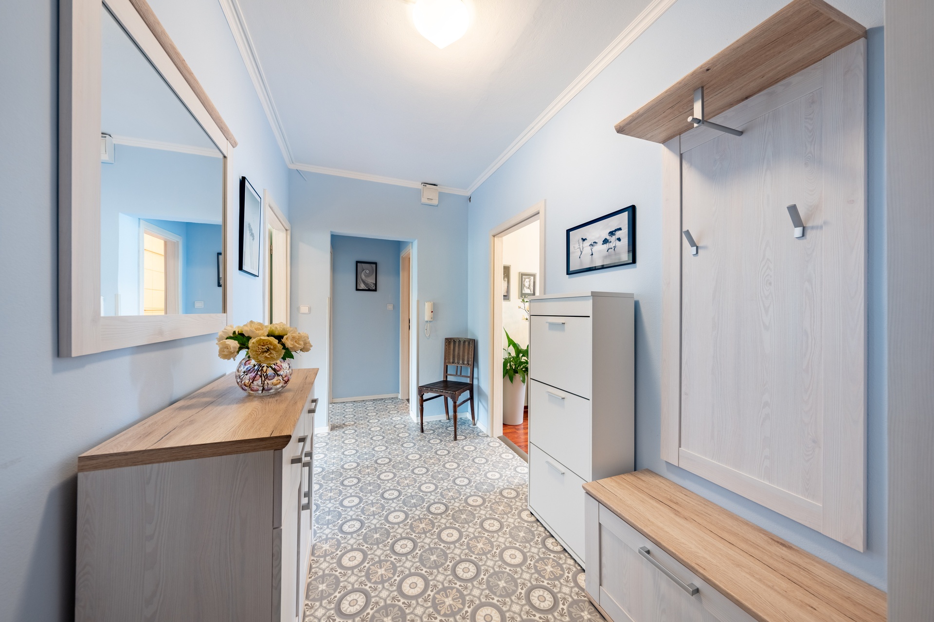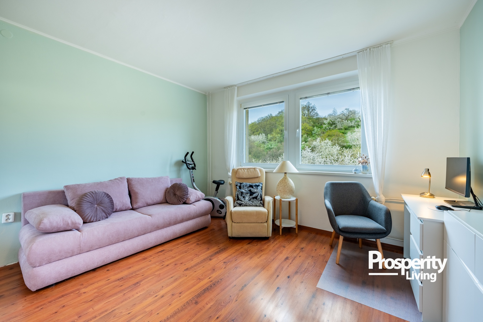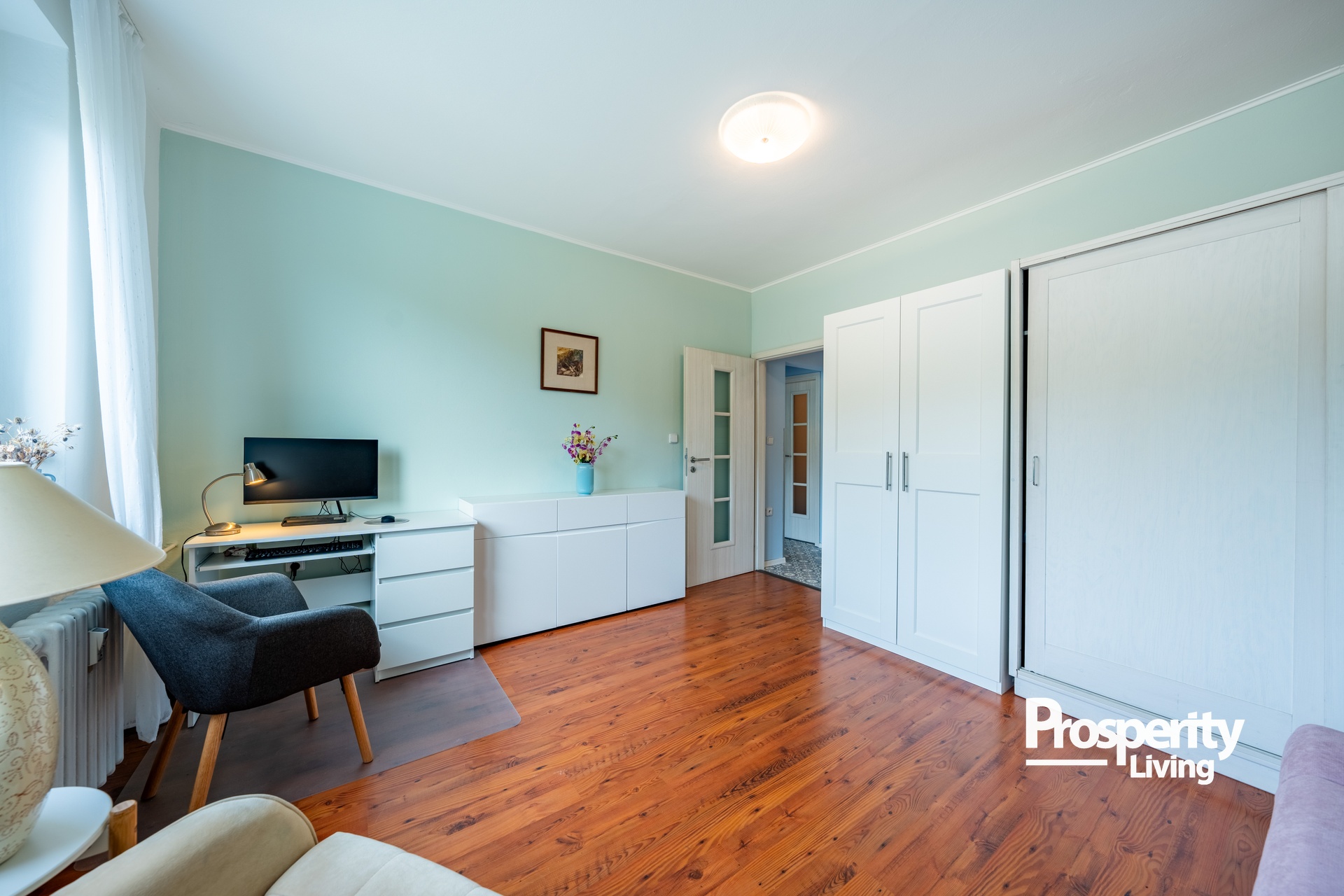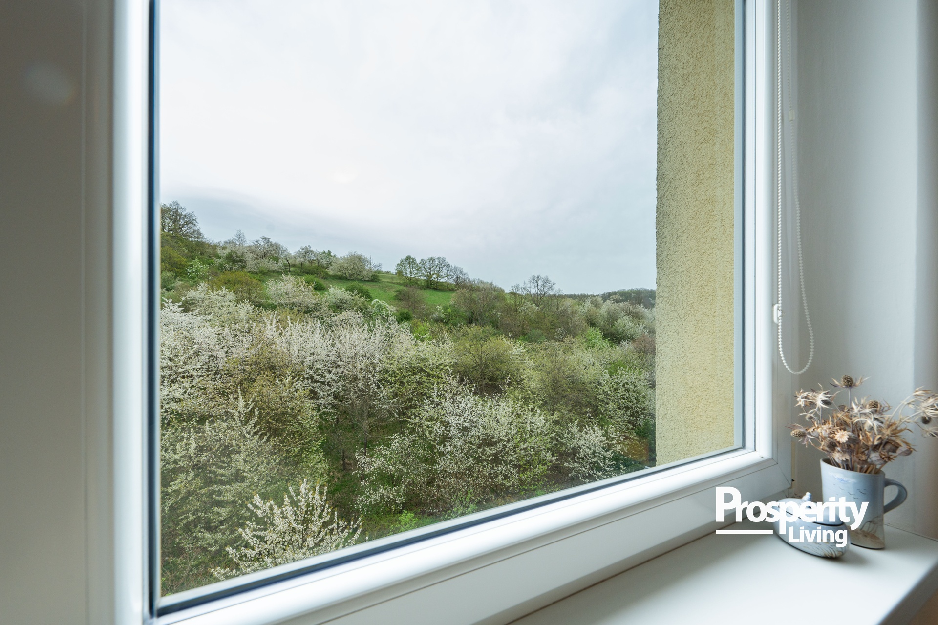 Celková dispozice bytu nabízí prostorný obývací pokoj, samostatnou kuchyni s jídelním koutem, dvě ložnice, předsíň s dostatkem úložných prostor, koupelnu a WC. Kuchyň je vybavena moderní linkou s vestavěnými spotřebiči včetně trouby, digestoře a pračky. Interiér působí svěže a útulně díky kvalitním podlahám, novým dveřím, neutrálním barvám a dostatku denního světla. Byt je částečně zařízený a připravený k okamžitému nastěhování.