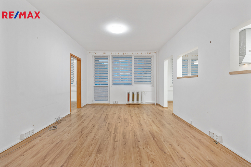 Samotný byt je ve velmi dobrém stavu, připravený k okamžitému nastěhování, případně k drobným úpravám dle vkusu nového majitele. Dispozice je praktická a vzdušná. Z chodby se vstupuje do všech místností samostatně. Kuchyně se nachází po pravé straně od vstupních bezpečnostních, dvanáctibodových protipožárních dveří a je vybavena moderní, prostornou kuchyňskou linkou s vestavěnými spotřebiči včetně plynového sporáku s digestoří a elektrické trouby. Z kuchyně se plynule vstupuje do obývacího pokoje, který je díky průhledům ve zdi světlý a působí otevřeně. Z obývacího pokoje je přímý vstup na lodžii orientovanou do klidného vnitrobloku s velkým dětským hřištěm a množstvím zeleně. Vedle obývacího pokoje se nachází dva samostatné neprůchozí pokoje - ložnice a např. dětský pokoj či pracovna, situovaný u vestavěných skříní. Koupelna je umístěna napravo u hlavního vstupu a disponuje rohovou vanou, umyvadlem a toaletou. Na podlahách je kombinace lina, plovoucích podlah a dlažby, na všech oknech jsou žaluzie den a noc. Byt má k dispozici sklepní kóji. Parkování je možné na veřejných parkovištích v bezprostředním okolí domu.