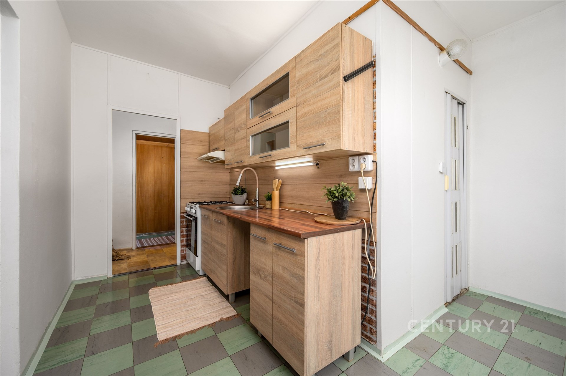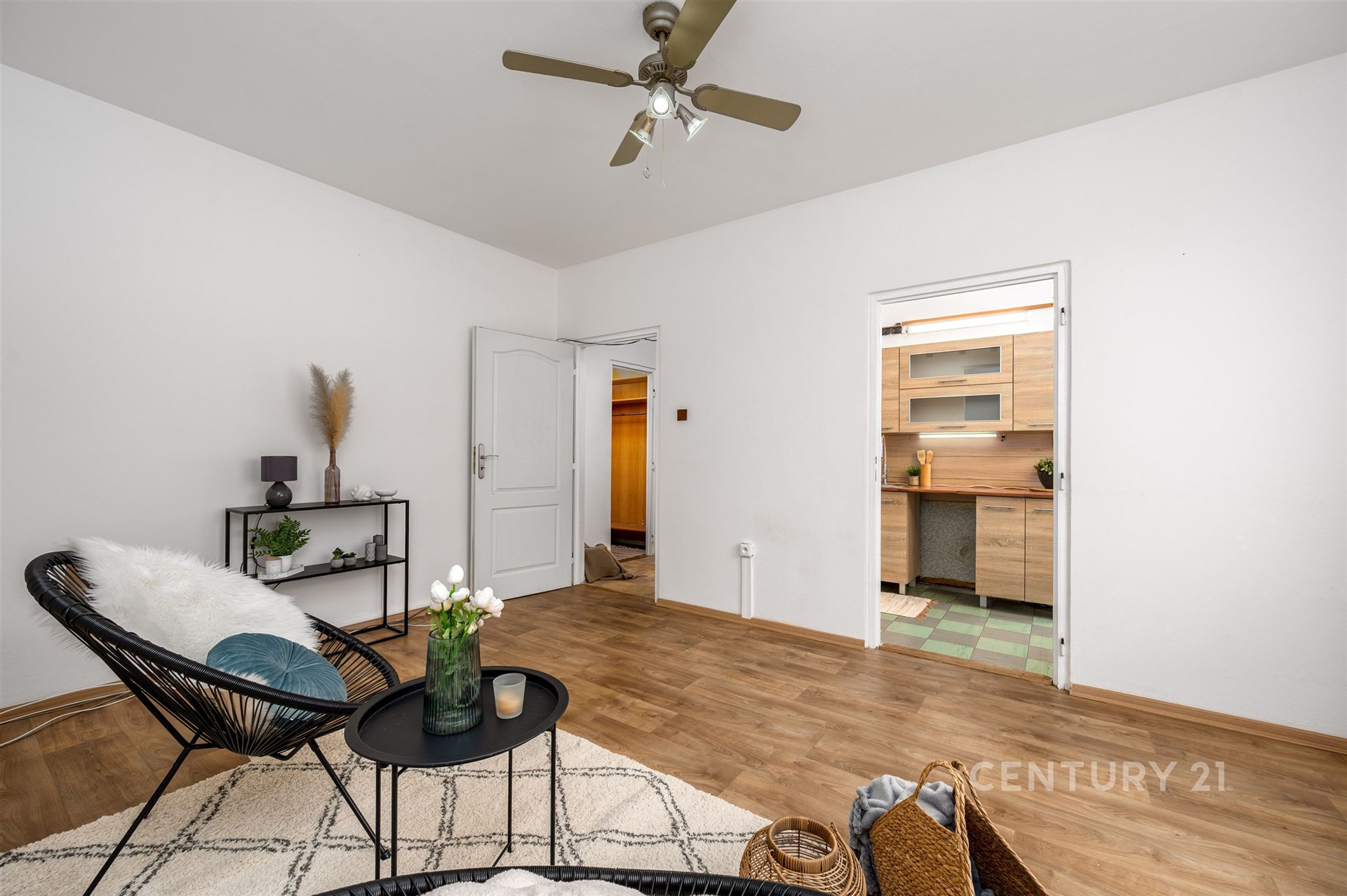 Jednotka je v původním, ale udržovaném stavu. Nový majitel se může okamžitě nastěhovat, nebo prostor modernizovat podle svých představ. Kromě obývacího pokoje, dvou ložnic a kuchyně je v bytě praktická šatna/komora. Původní umakartové jádro má většinu povrchu opatřenou dekorativní úpravou, podlahy jsou laminátové a PVC a v předsíni zůstala zachovaná vestavěná skříň.