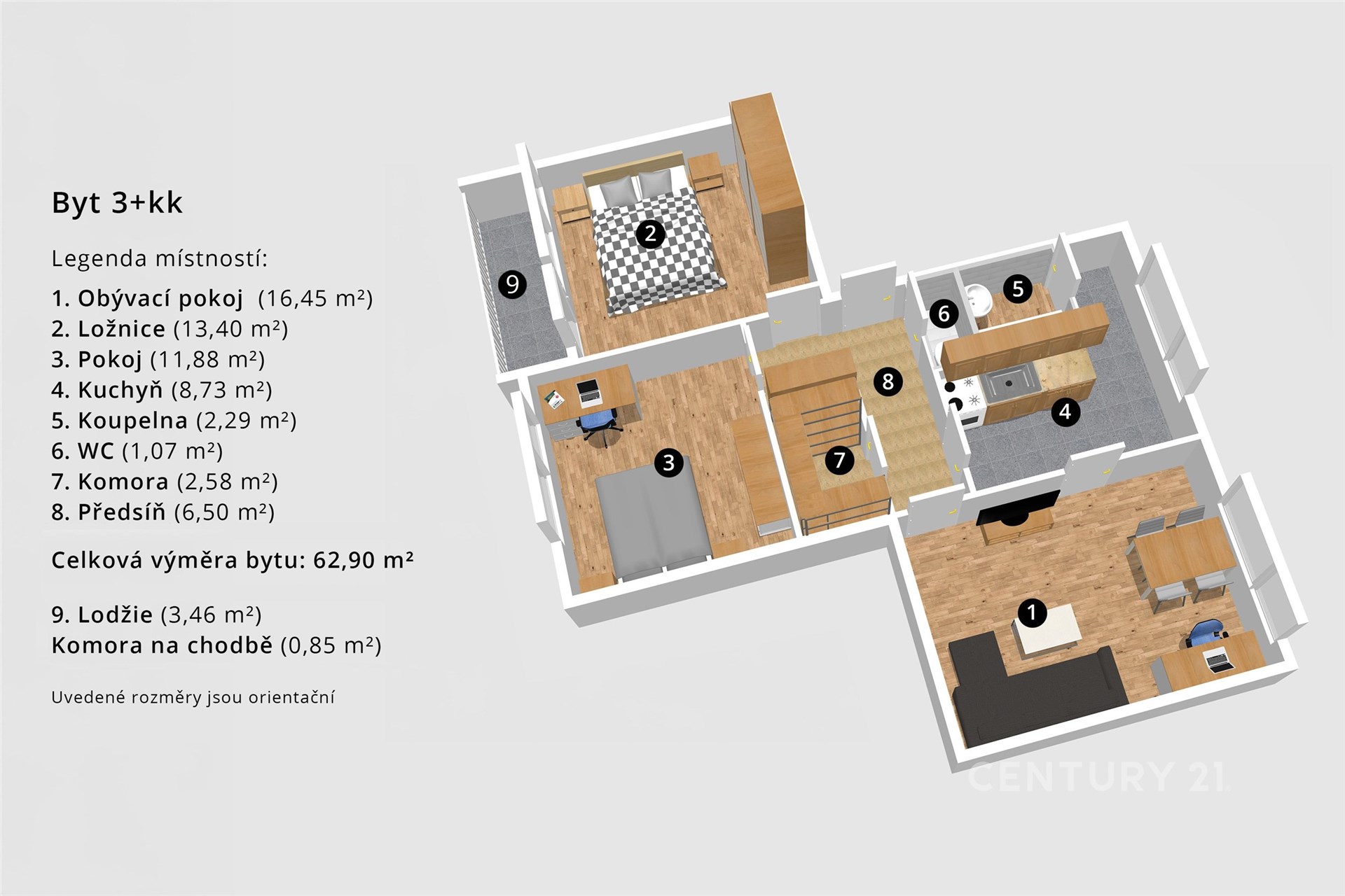 Byt samotný má výměru 62,90 m² je orientovaný na severovýchod a jihozápad, díky čemuž je nádherně světlý po celý den. Ranní světlo příjemně prozařuje obě ložnice, odpolední slunce pak dodává útulnou atmosféru obývacímu pokoji s kuchyní. Lodžie (cca 3,50 m²) orientovaná na SV nabízí příjemné posezení i v horkých letních dnech. Benefitem je praktická komora (1,20 m²) umístěná v mezipatře domu.
