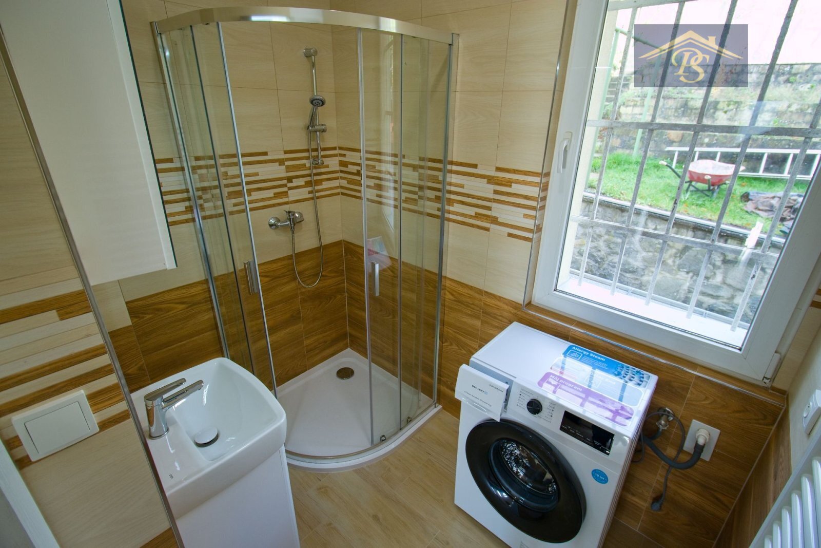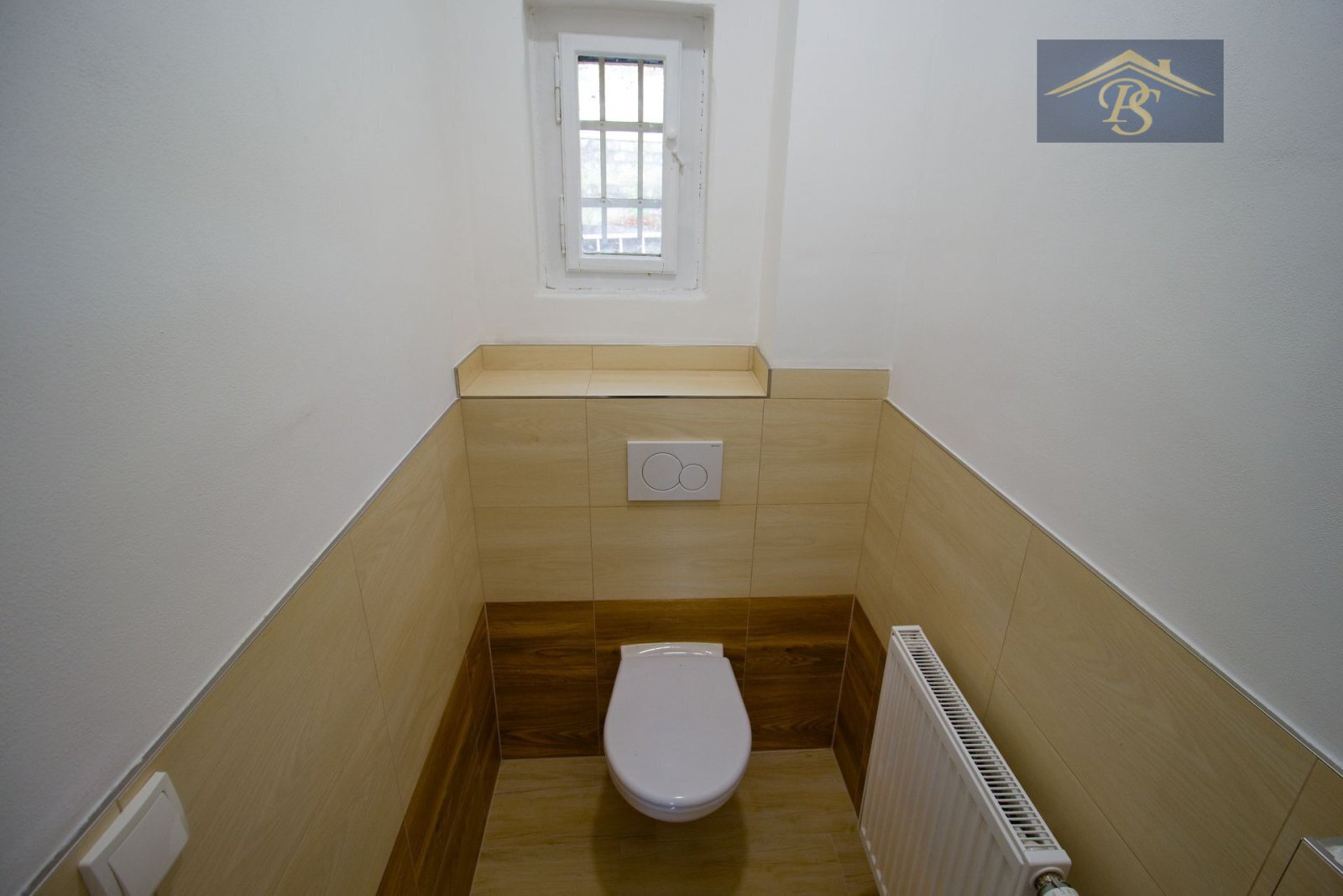 V koupelně je instalován sprchový kout, umyvadlo se skříňkou a zrcadlo s osvětlením. Moderní obklady v přírodních tónech doplňují celkový svěží styl interiéru. Samostatná toaleta je vybavena závěsným WC systémem s podomítkovou nádržkou Geberit, který zajišťuje snadnou údržbu a čistý vzhled prostoru.