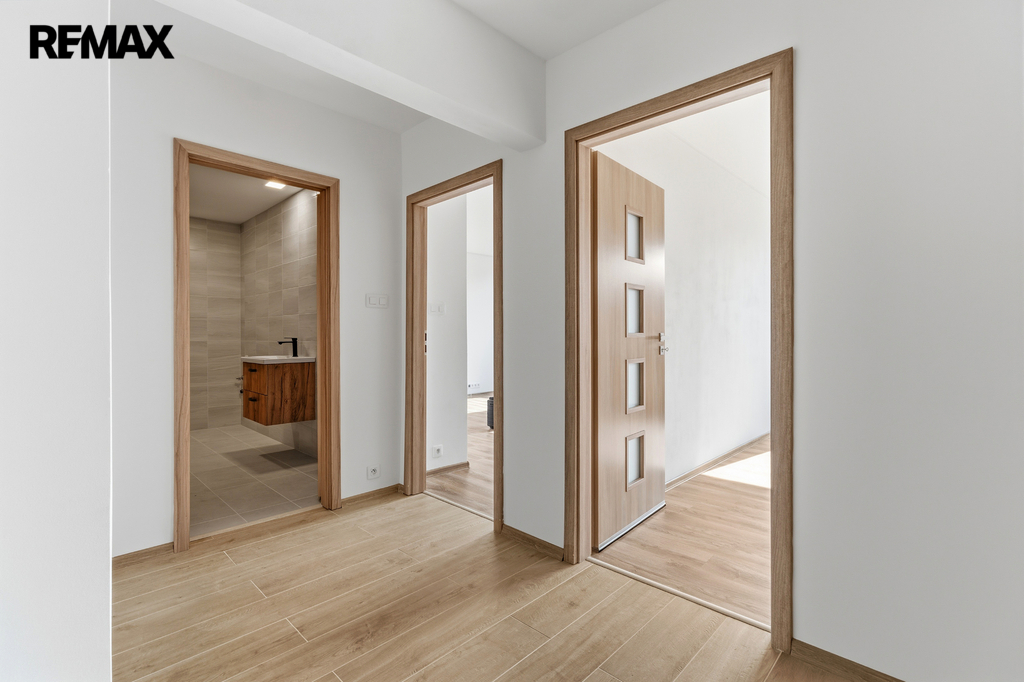 Po vstupu do bytu v šestém nadzemním podlaží vás přivítá prostorná předsíň, která logicky rozděluje celý prostor bytu. Srdcem domova je hlavní pokoj s novou kuchyňskou linkou vybavenou indukční deskou, kde díky velkým oknům a orientaci bytu nechybí přirozené světlo po celý den. Druhá místnost je ideální jako ložnice a poskytuje dostatek klidu pro odpočinek. Koupelna po levé straně od vstupu prošla velmi zdařilou proměnou a působí moderním dojmem – najdete v ní velkorysý sprchový kout se stylovou skleněnou zástěnou, skříňku s umyvadlem a závěsnou toaletu Geberit. Celkový dojem čistoty a vkusu podtrhují nové obklady, dlažba, snížené stropy a kvalitní obložkové zárubně s pěknými dveřmi, které ladí s celkovým designem interiéru.