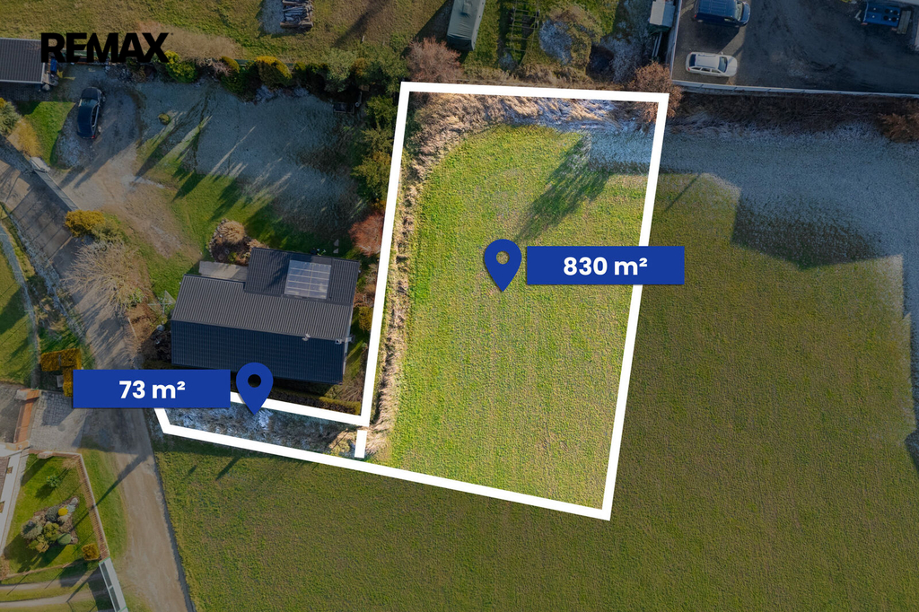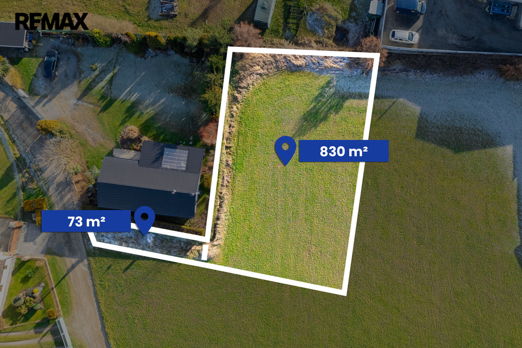 Specifikace pozemku: Parcelní číslo 280/10 o výměře 830 m2 (rozměry cca 22,5 m x 36 m) a parcelní číslo 280/18 o výměře 73 m2 (příjezdová cesta, která navazuje na obecní komunikaci). Druh pozemků: orná půda.