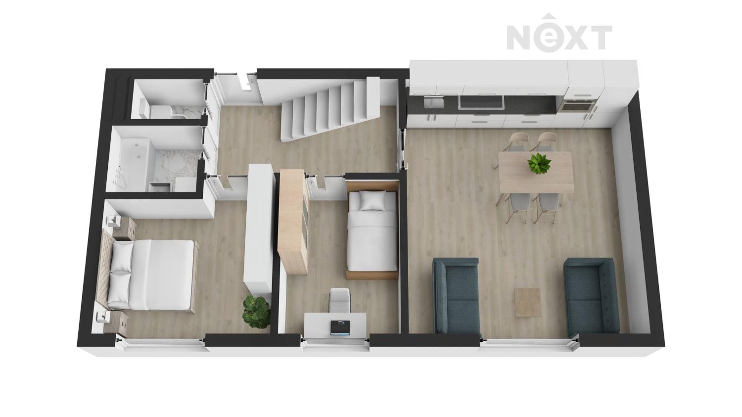 Samotný byt je promyšlený tak, aby fungoval v běžném rodinném provozu. Světlý obývací prostor s kuchyní tvoří přirozené centrum domova, kde se potkáváte, jíte i odpočíváte. Dvě samostatné ložnice dávají každému členu rodiny vlastní klidný prostor – dětem na hraní i učení, rodičům na odpočinek. Dřevěné podlahy dodávají interiéru teplo, elektrické předokenní žaluzie zase pohodlí a kontrolu nad světlem i soukromím. Dům z roku 2019 je ve velmi dobrém stavu, vytápěný tepelným čerpadlem a v energetické třídě C – provozně rozumný i do budoucna.