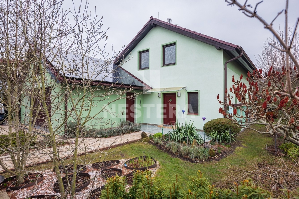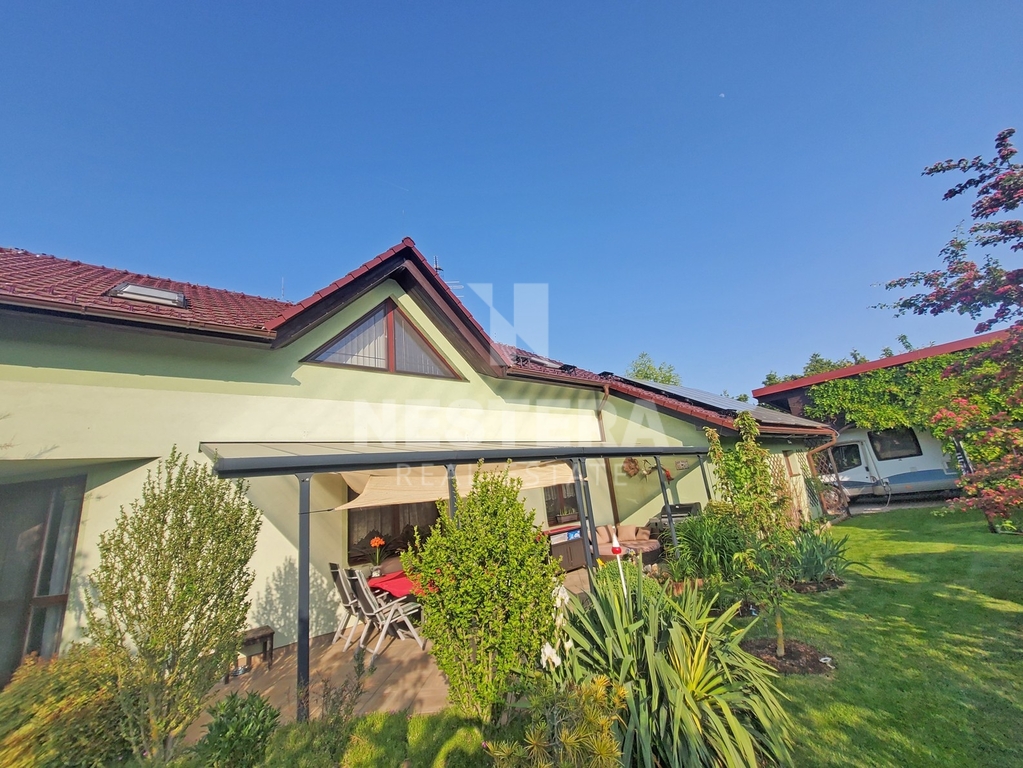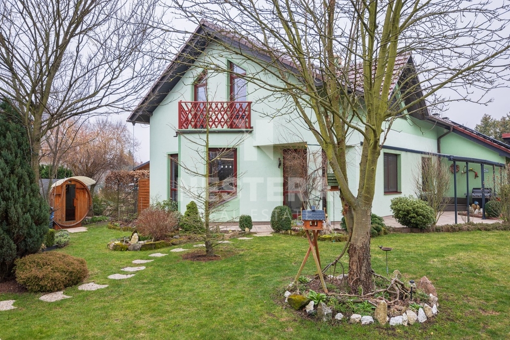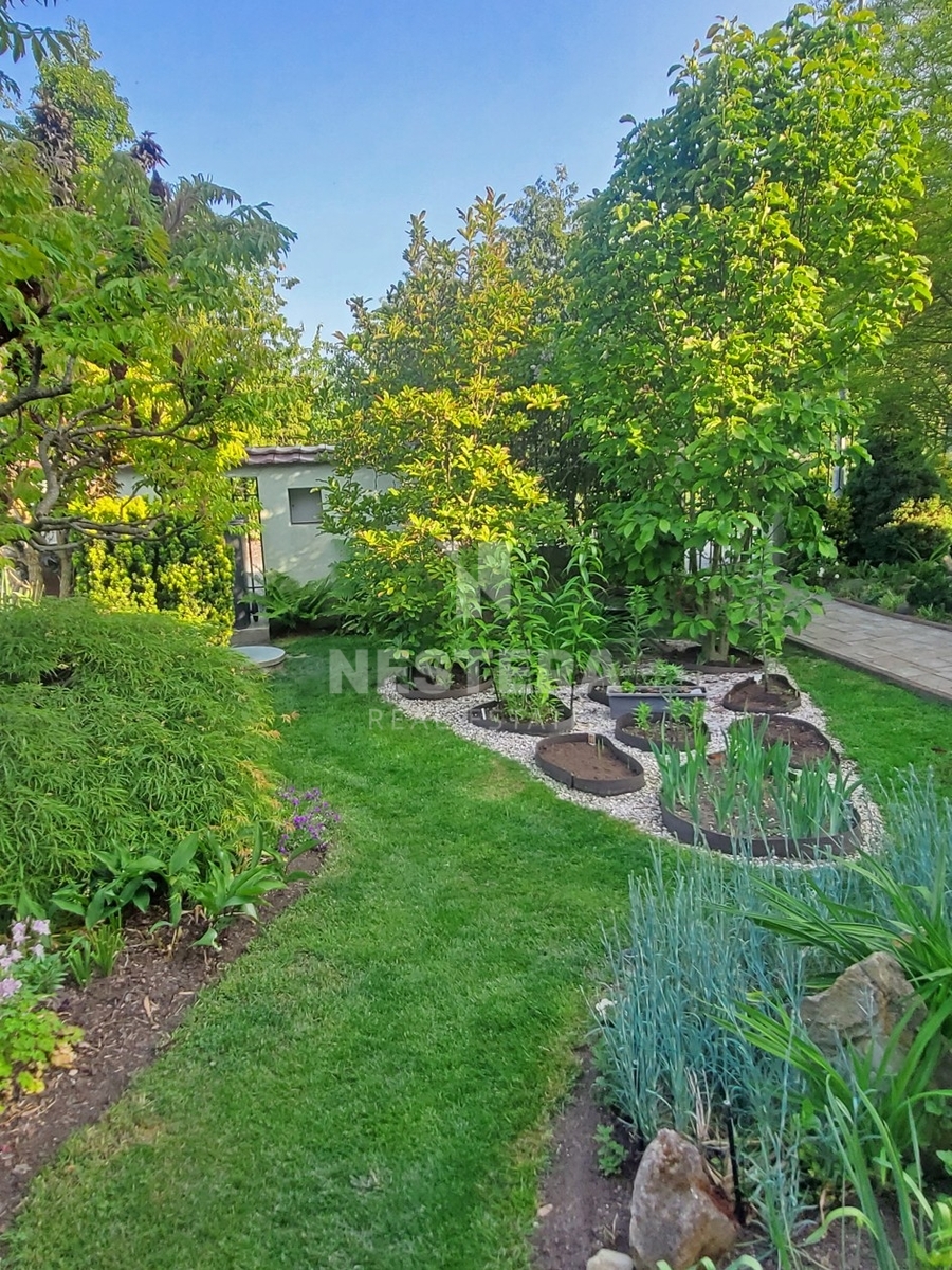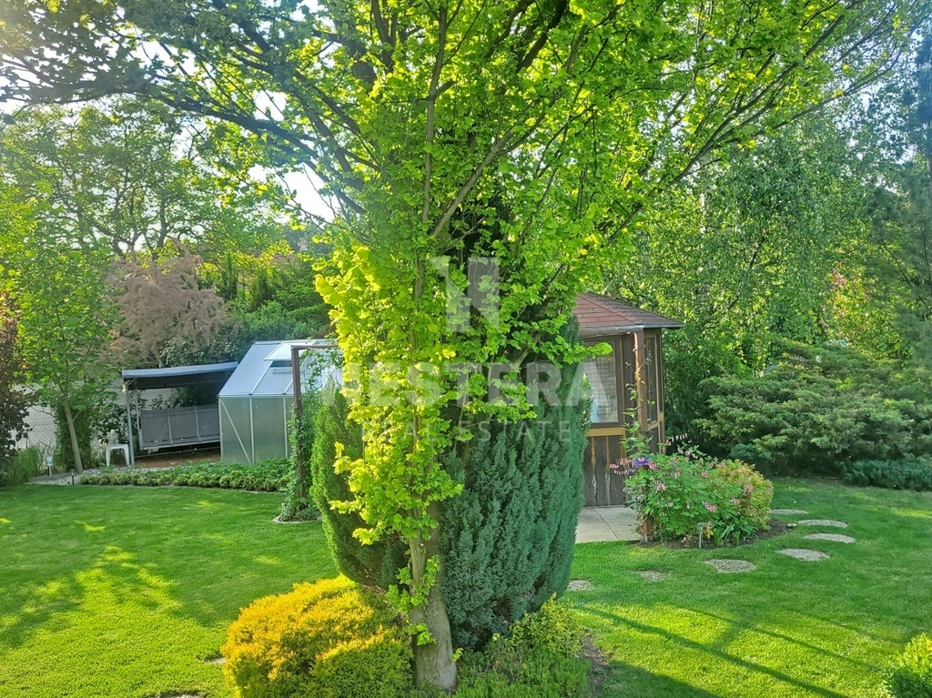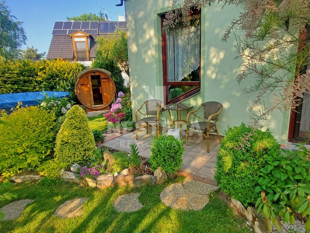 Dům obklopuje pečlivě udržovaná zahrada s převážně okrasnou zelení, na které se nachází dřevěný altán, skleník a plně funkční sudová sauna.