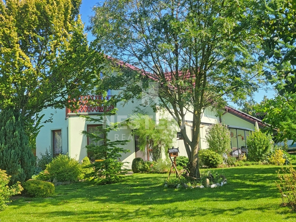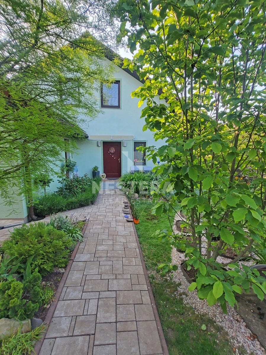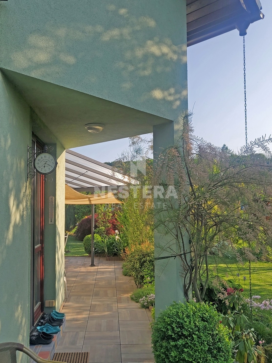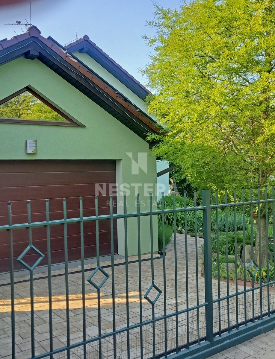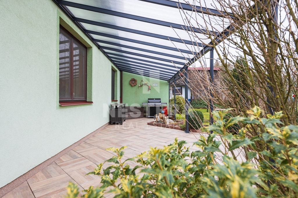 Dům obklopuje pečlivě udržovaná zahrada s převážně okrasnou zelení, na které se nachází dřevěný altán, skleník a plně funkční sudová sauna.