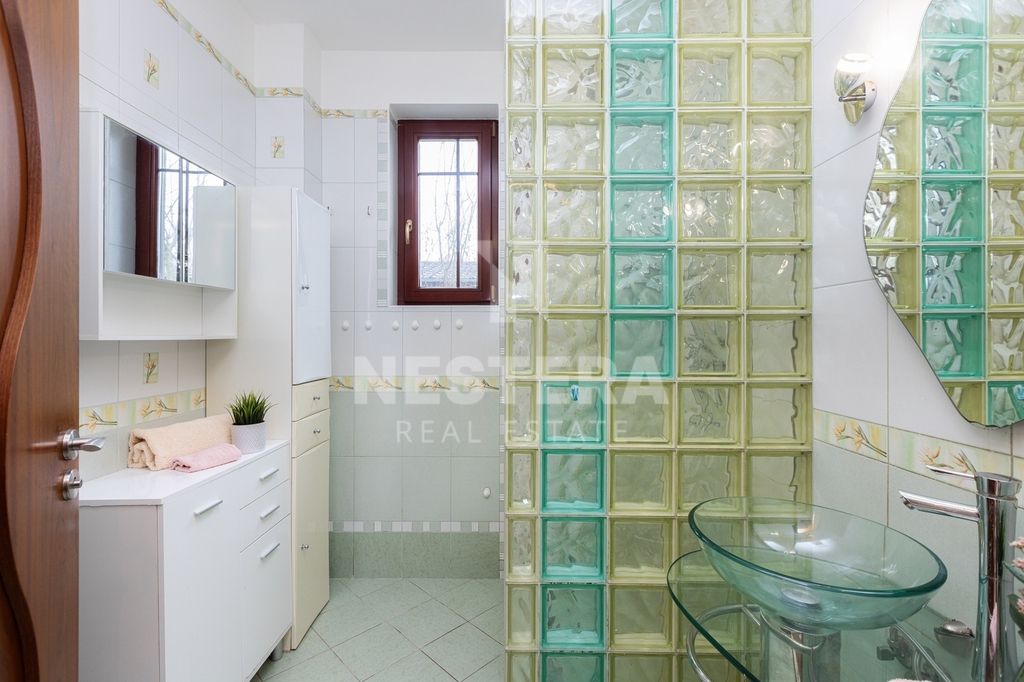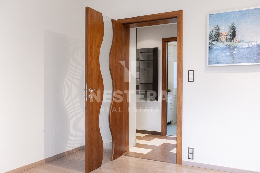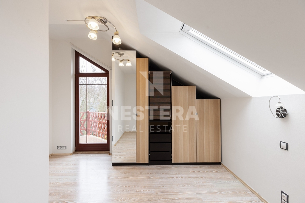 Po schodišti se dostanete do chodby v prvním patře, odkud je přístup do čtyř ložnic, z nichž dvě mají vstup na menší balkon s výhledem na Klánovický les. V patře je také prostorná koupelna s vanou a dvěma umyvadly a samostatná toaleta s bidetem a pisoárem.