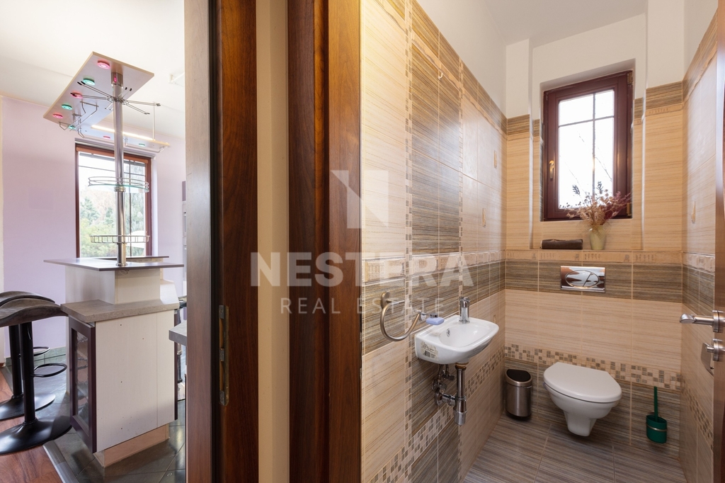 V přízemí se nachází prostorná předsíň s vestavěnými skříněmi, na kterou navazuje chodba se vstupy do jednotlivých místností. Na jejím konci je vstup do rozlehlého obývacího pokoje s krbovými kamny, propojeného s jídelním koutem a kuchyní. Tento hlavní obytný prostor prošel v loňském roce rekonstrukcí. Původní kuchyňská linka byla odstraněna a prostor je připraven na instalaci nové kuchyně dle představ budoucích majitelů. Součástí rekonstrukce byla také instalace podlahového vytápění a kvalitních dřevěných podlah. Z obývacího pokoje je přímý vstup na terasu s pergolou a do zahrady. V přízemí se dále nachází koupelna se sprchovým koutem, spíž, toaleta s umyvadlem a další pokoj vhodný jako pracovna, pokoj pro hosty nebo herna.