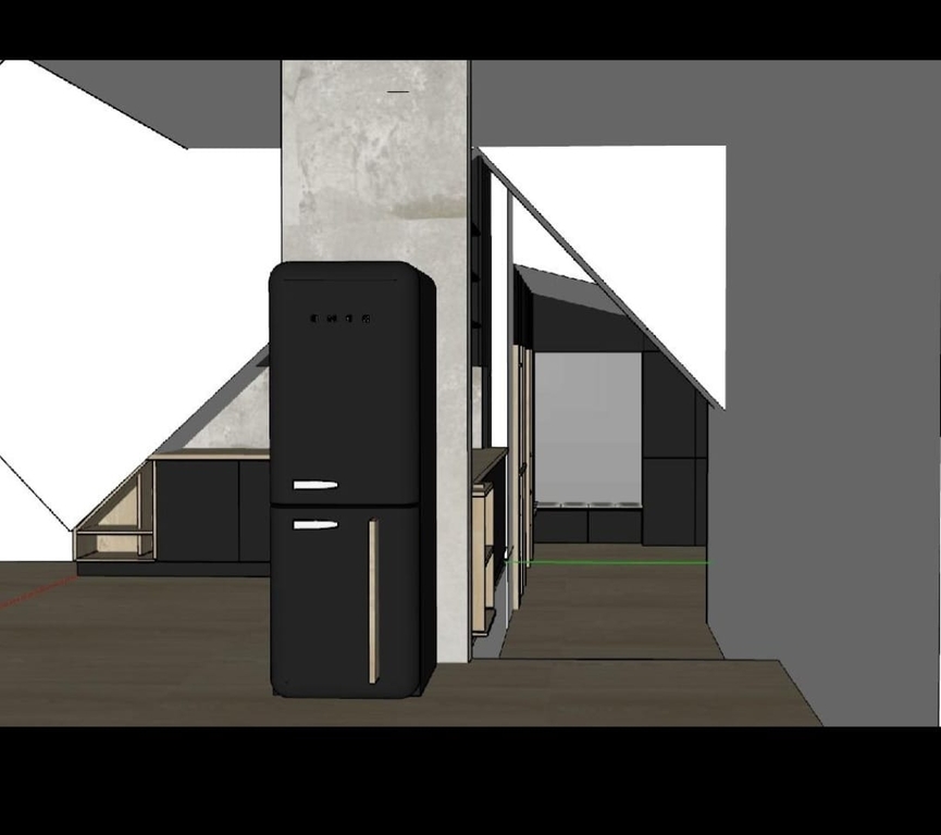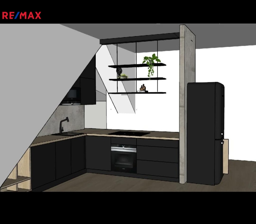 • Vyvýšená část prostoru přirozeně vymezuje kuchyňský kout, který bude dodělán a plně funkční