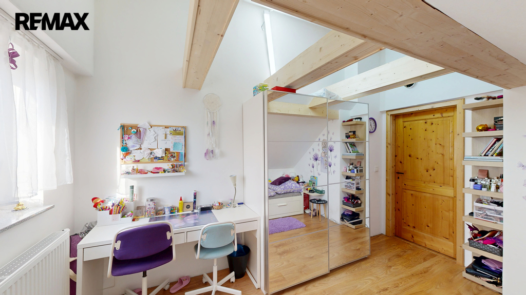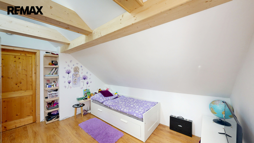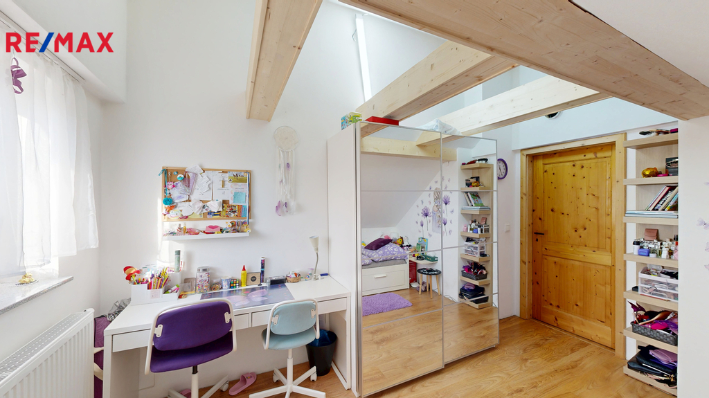 V patře najdete druhou koupelnu a tři samostatné pokoje, záleží na Vás, zda je využijete jako ložnice, pokoje pro hosty nebo například pracovny. Velká okna zajišťují dostatečné prosvětlení a praktické uspořádání místností nabízí spoustu úložného prostoru i ve dvou šatnách. Snadno oddělit soukromé zóny od společenských umožňuje rozdělení domu do tří podlaží.