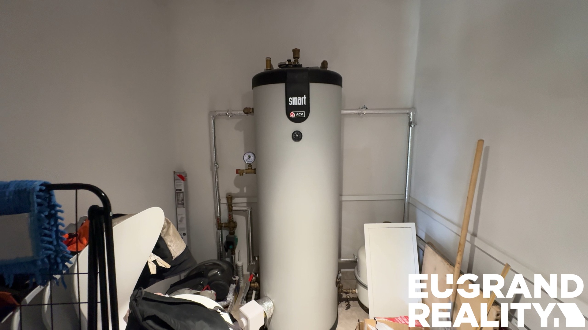 Vytápění je řešeno krbovou vložkou s rozvodem do podlahy v kombinaci s úspornou elektrickou patronou v akumulační nádrži, což zajišťuje nízké provozní náklady. Objekt je napojen na městský vodovod i kanalizaci.