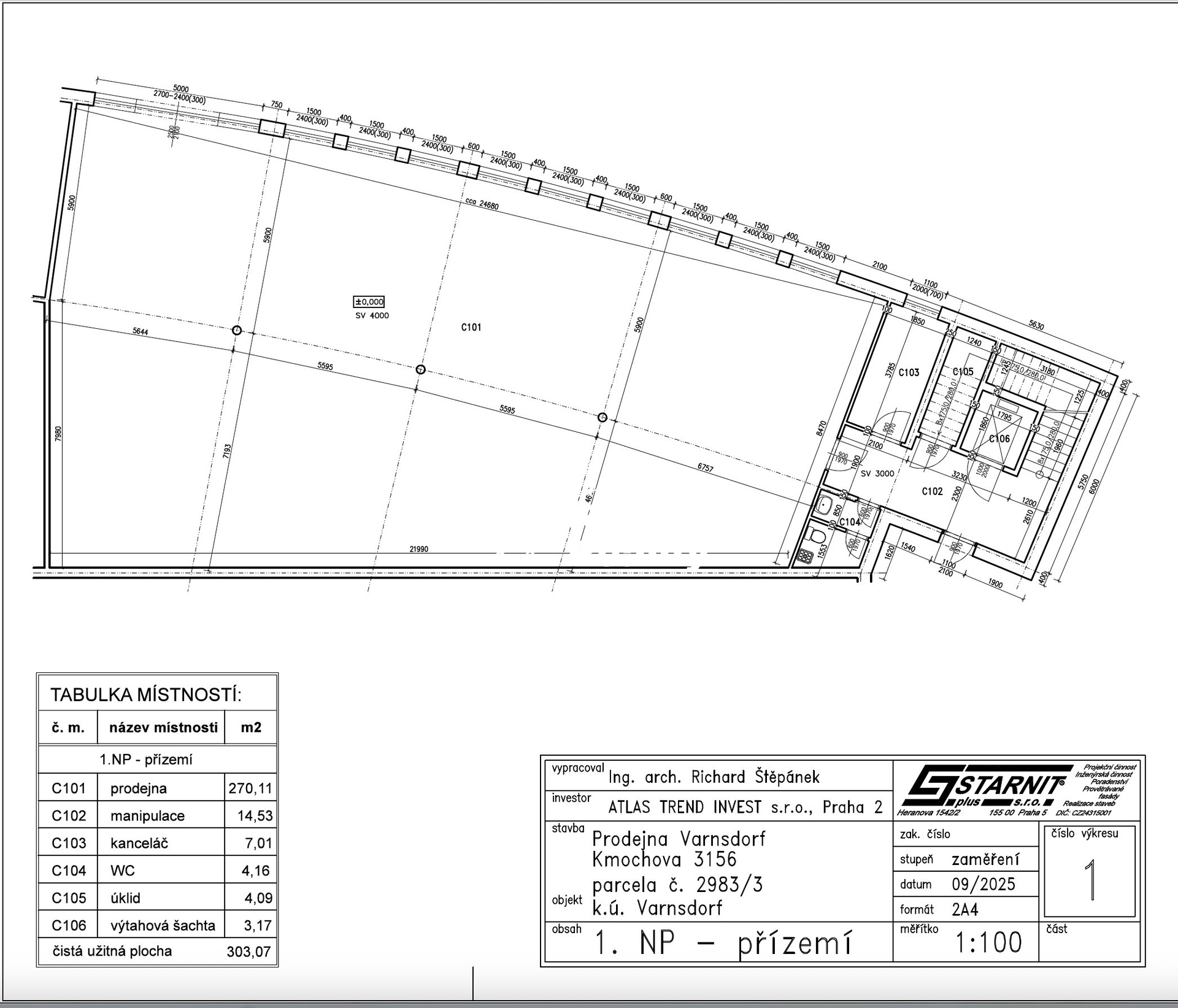 1. NP – prodejní prostor / obchodní část (303,07 m²)