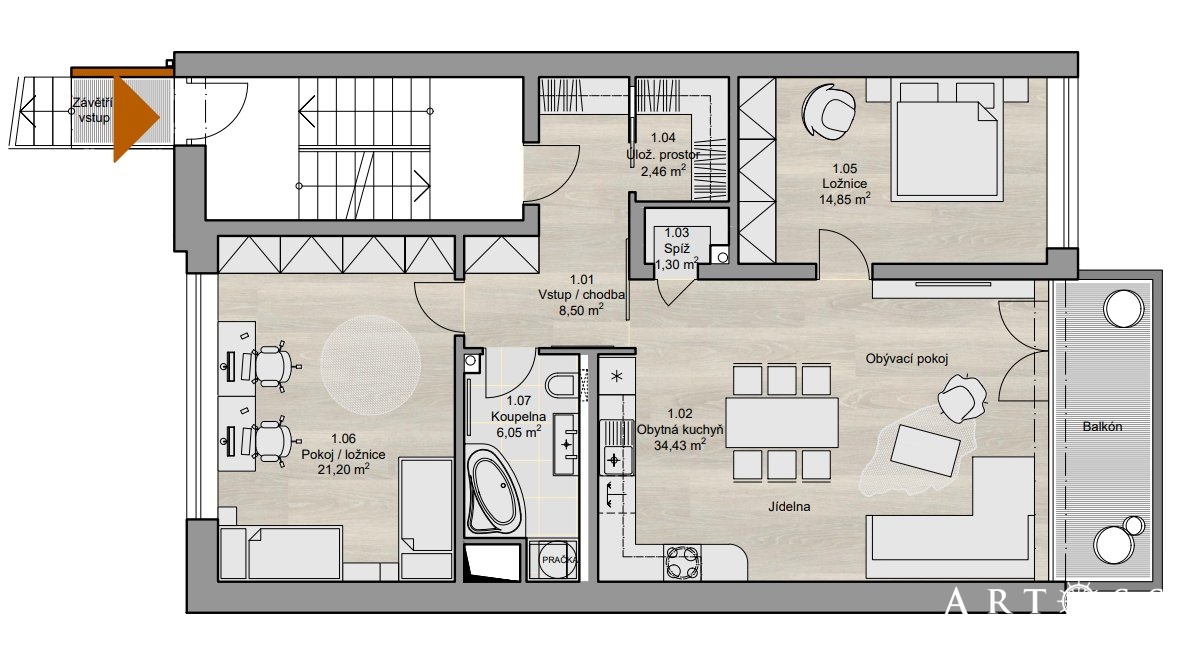 Dominantou bytu je obývací pokoj s kuchyňským koutem o rozloze 34,4 m² s přímým vstupem na balkon (6,7 m²), odkud vás okouzlí nerušený výhled na okolní louky a lesy. Byt je navržen tak, aby poskytoval maximální ergonomii a prostor – nechybí ani samostatná zděná spíž v kuchyni a prostorná šatna u vstupu.