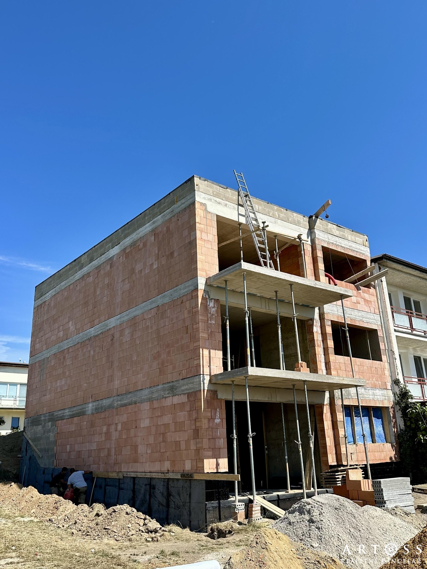 Tento cihlový dům nejvyšší kvality byl postaven s maximálním důrazem na energetickou úspornost a dlouhou životnost. Všechny stropy včetně střešní konstrukce jsou monolitické železobetonové, příčkové zdivo zděné, interiérové dveře vysoké 210 cm a po celém bytě je komfortní podlahové vytápění.