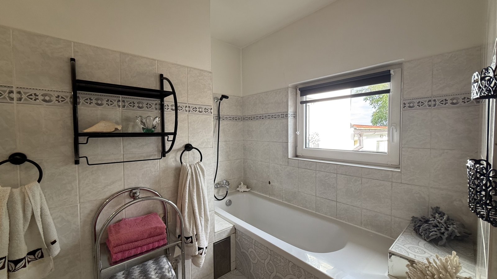 Součástí přízemí je rovněž ložnice, koupelna s vanou, samostatné WC a úklidová místnost. V chodbě jsou instalovány vestavěné skříně poskytující dostatek úložného prostoru.