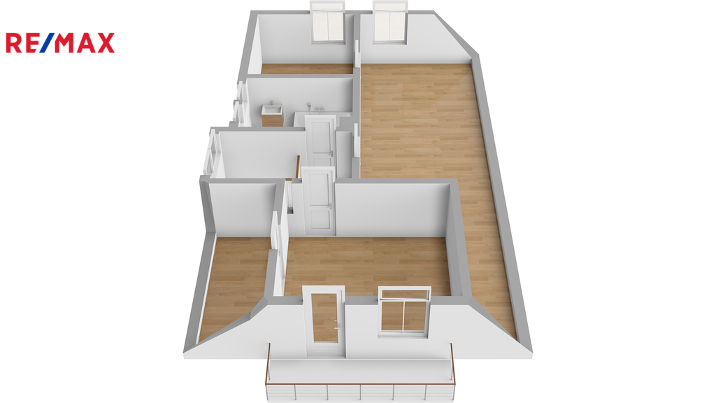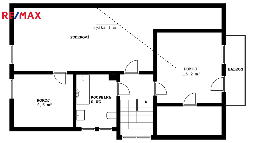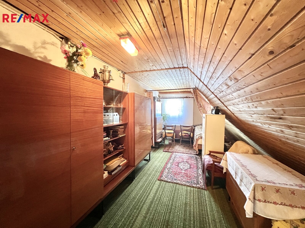V patře je koupelna, pokoj s balkónem a dvě podkrovní místnosti o užitné ploše 53 m².
