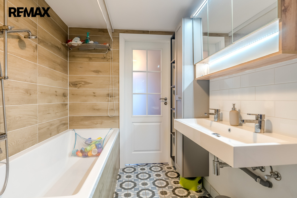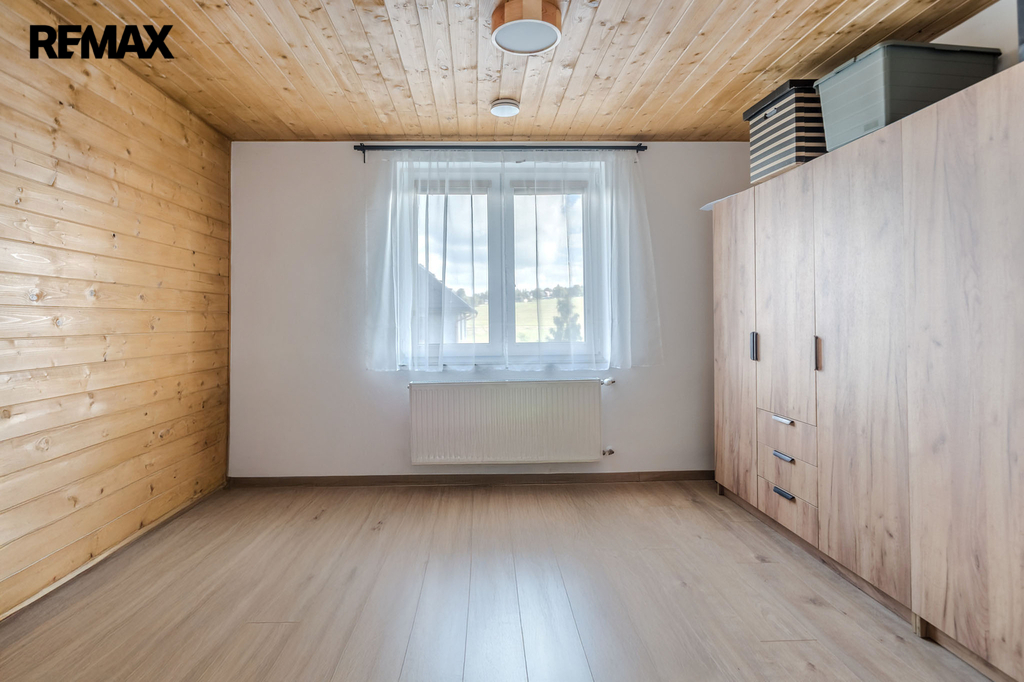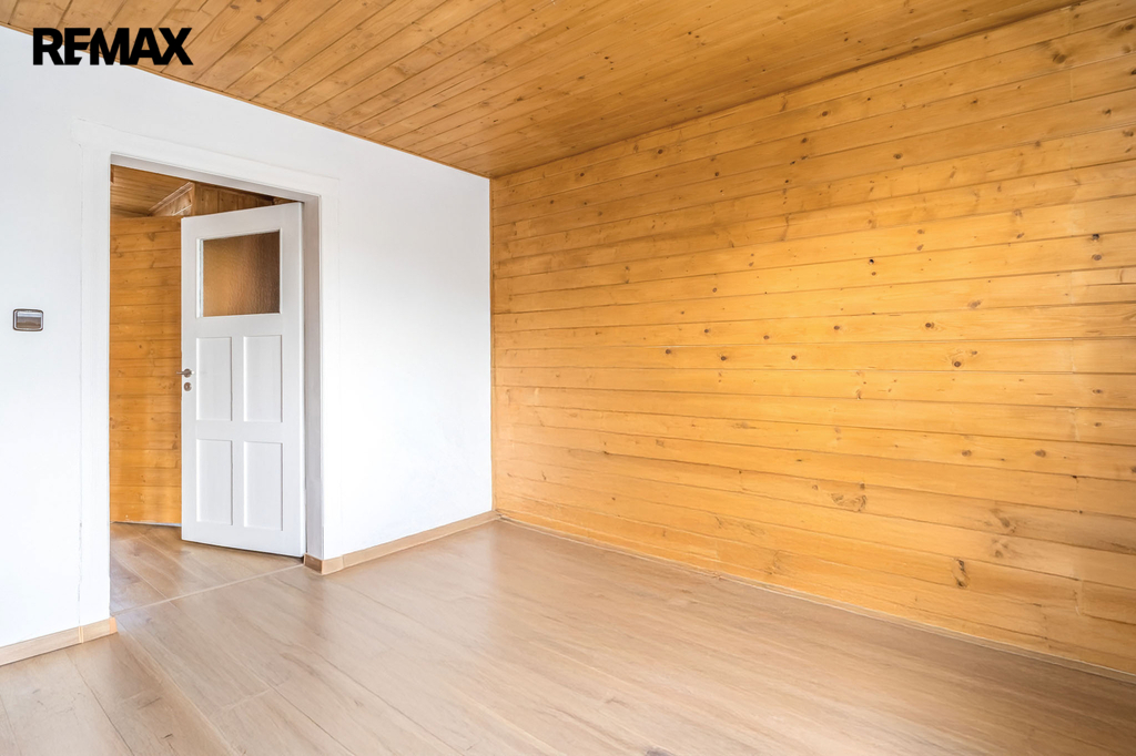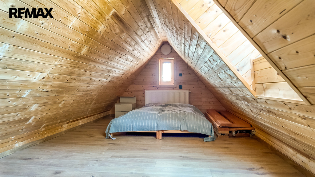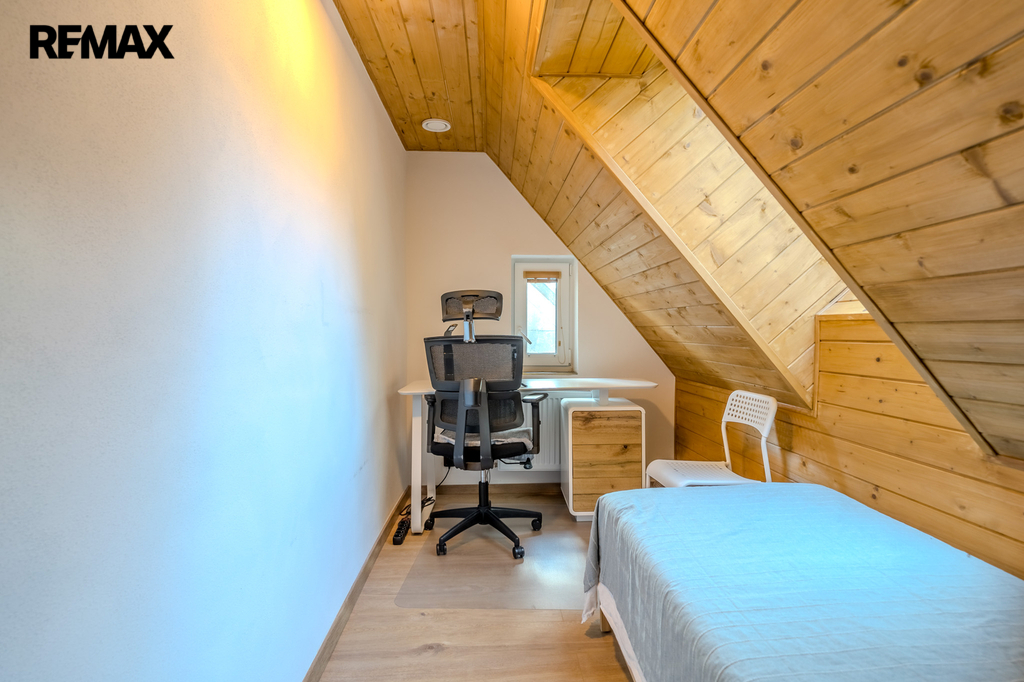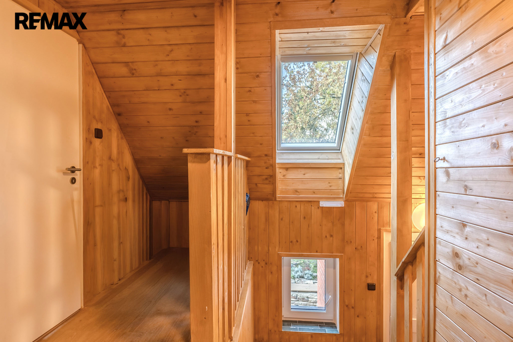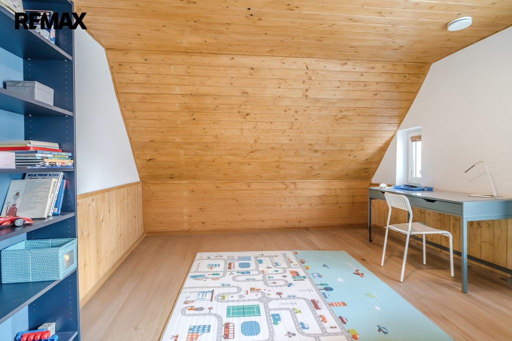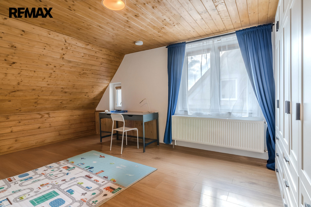 Ve druhém nadzemním podlaží se nacházejí tři samostatné, světlé pokoje a na mezipatře je umístěna samostatná toaleta. V podkroví domu vás překvapí útulná místnost s dřevěným obložením, která může sloužit jako ložnice, pracovna nebo relaxační prostor. Celková podlahová plocha domu činí 144 m².